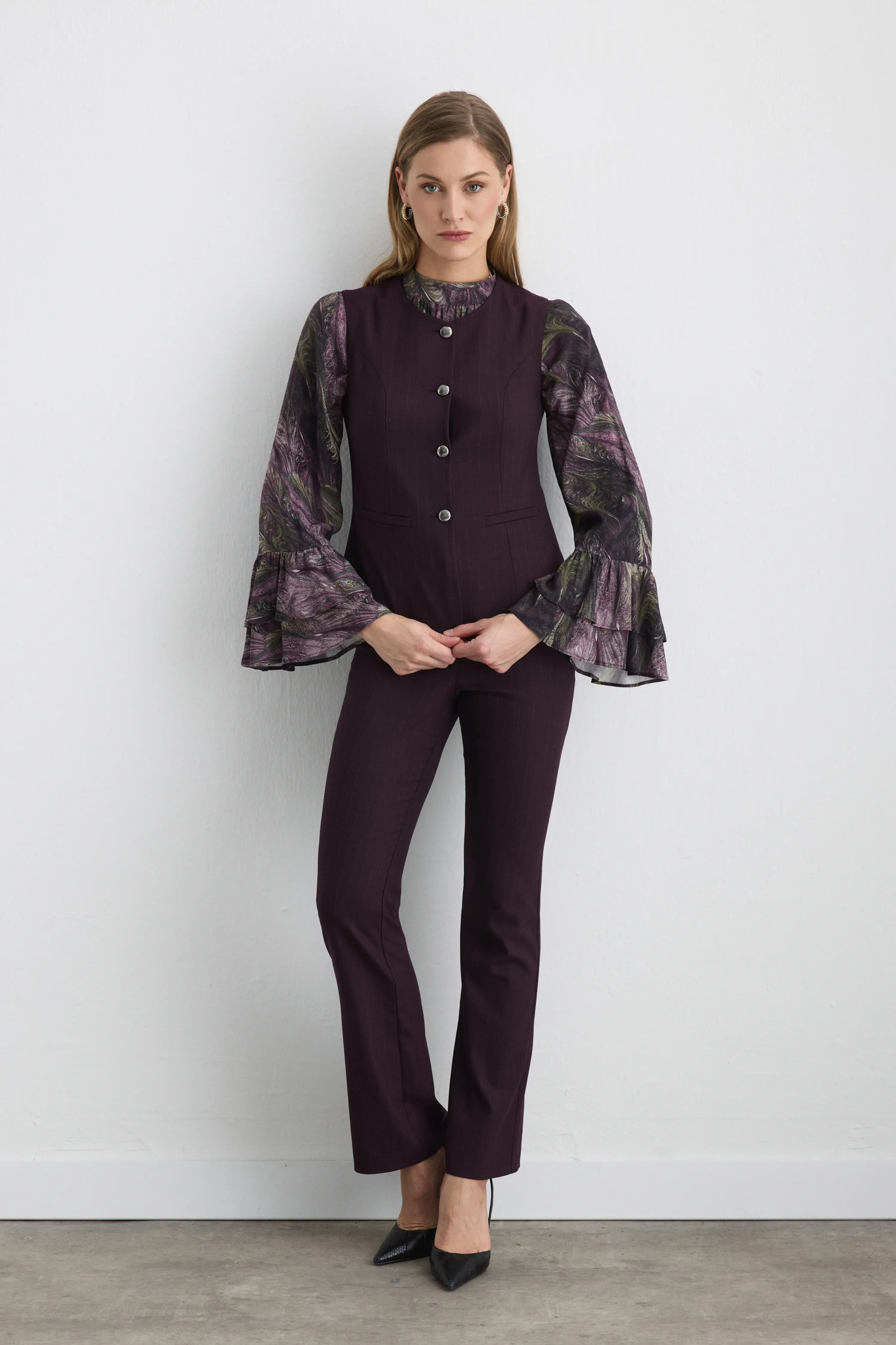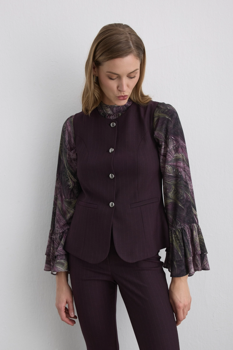 Its fluid structure gives an elegant drape. The diagonal cut creates a dynamic silhouette. The taupe tone adds warm sophistication. Can be paired with heels for special occasions or flat shoes for daily use. Soft fabric provides comfortable experience.