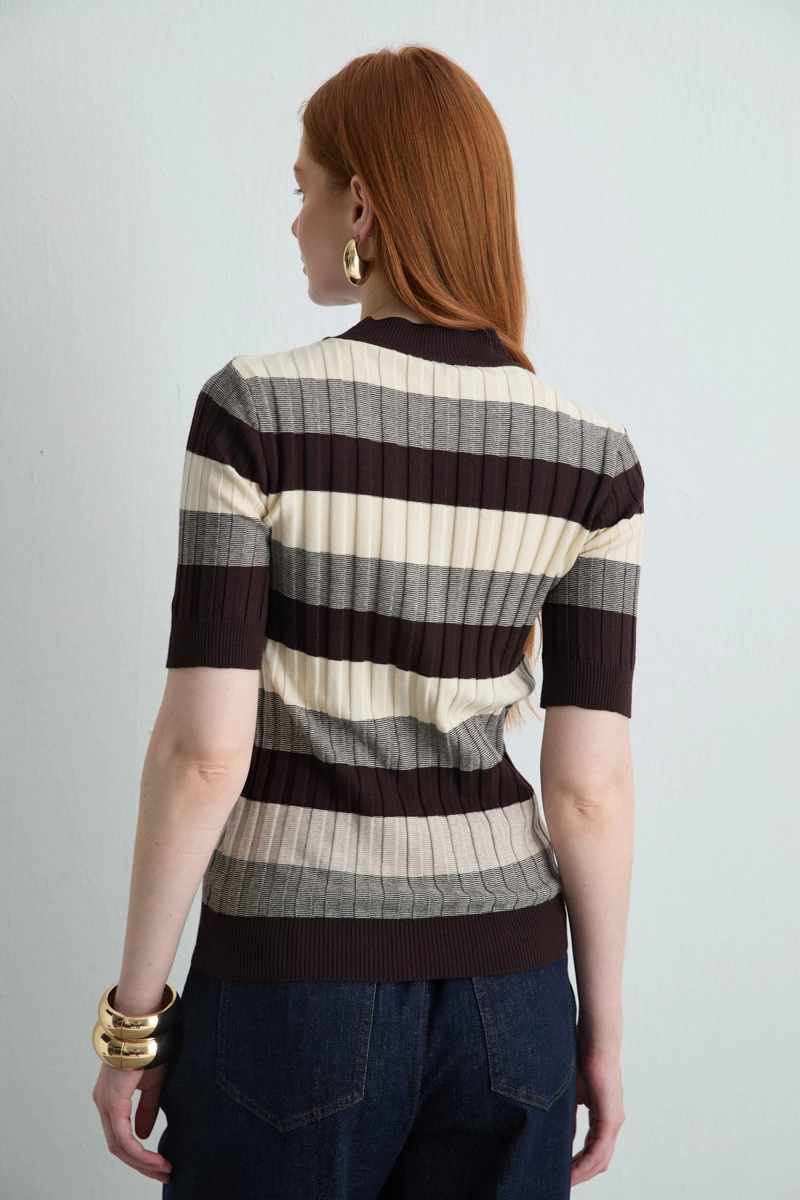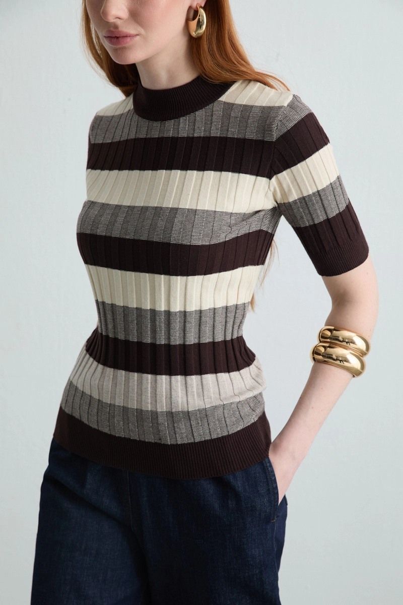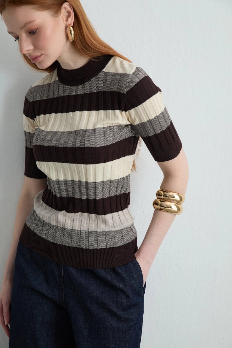 Blouse in brown tones with elegant stripes is perfect for late summer and spring outfits. The half-sleeve design allows freedom of movement while adding a dynamic touch to your style. Minimal details make it easy to pair with various bottoms.
