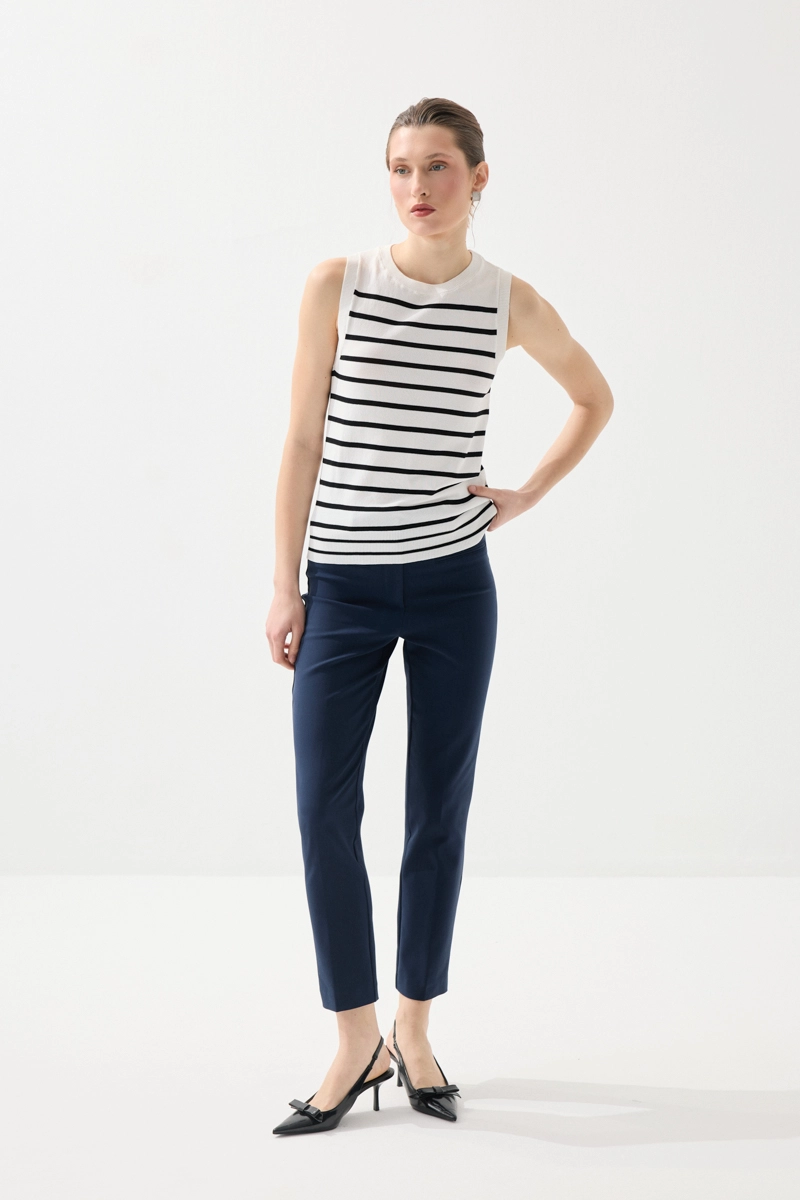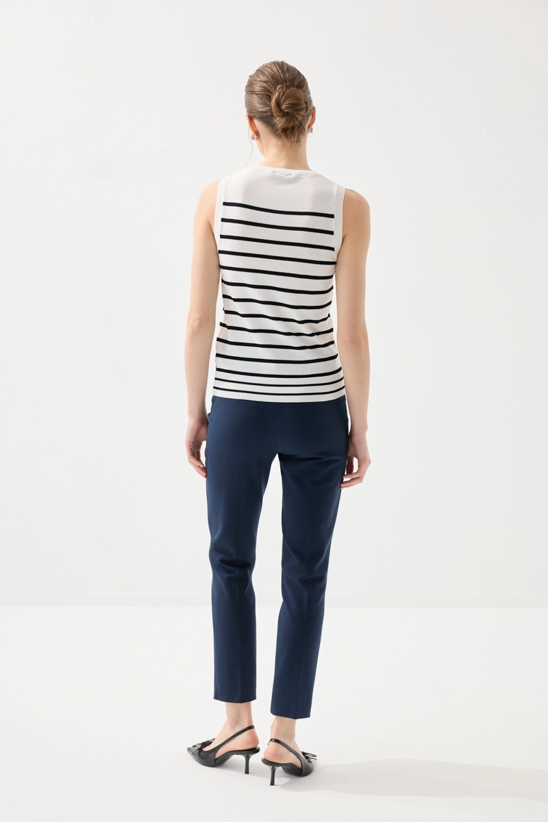 This mercerized knit blouse with a striped pattern offers a modern and stylish look, standing out with its shiny texture. Its lightweight structure ensures comfortable wear throughout the day. Its breathable fabric provides a fresh feel, especially in warm weather. With its elegant and refined design, it pairs well with both casual and classic combinations. It is set to become one of the key pieces in your wardrobe.