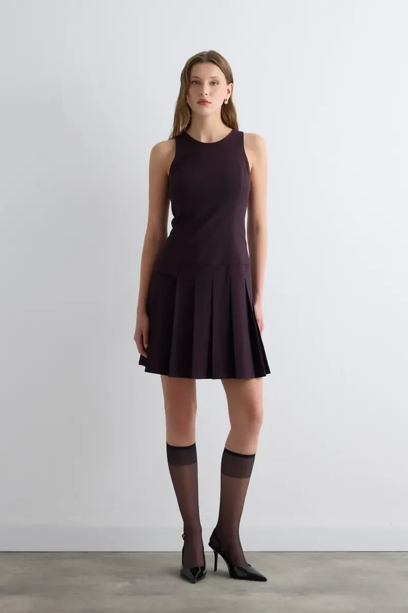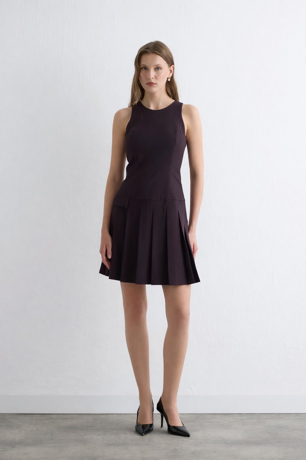 The pleated detail offers graceful movement. The striped pattern gives a modern look. The mulberry tone highlights elegance. Easily pairs with different pieces in layered combinations to create a unique style.