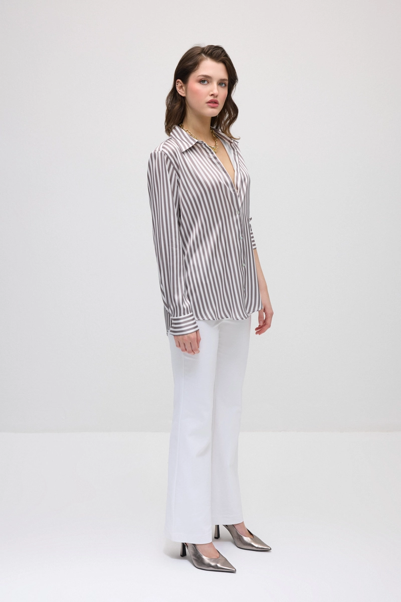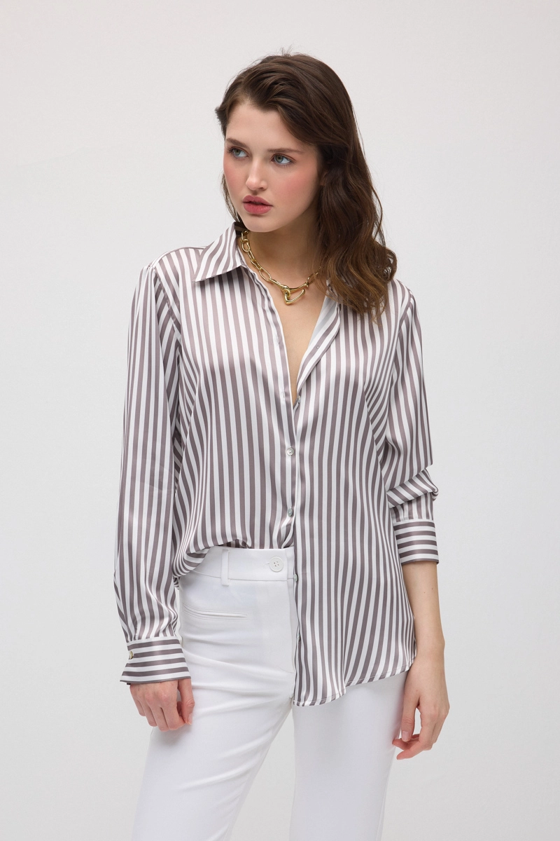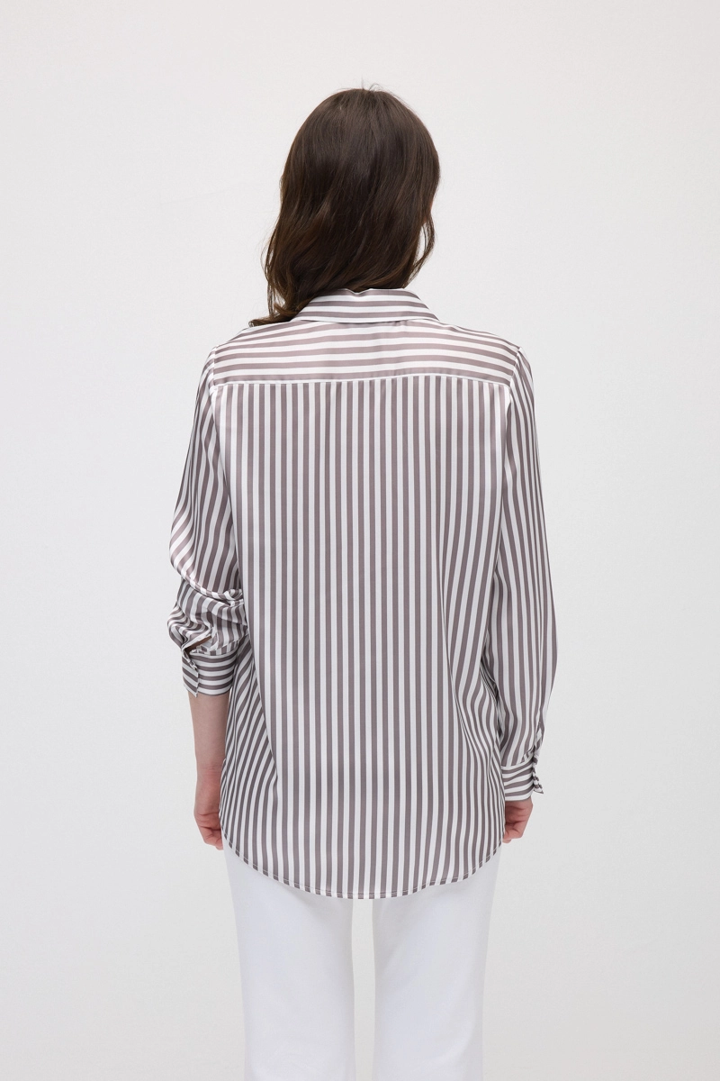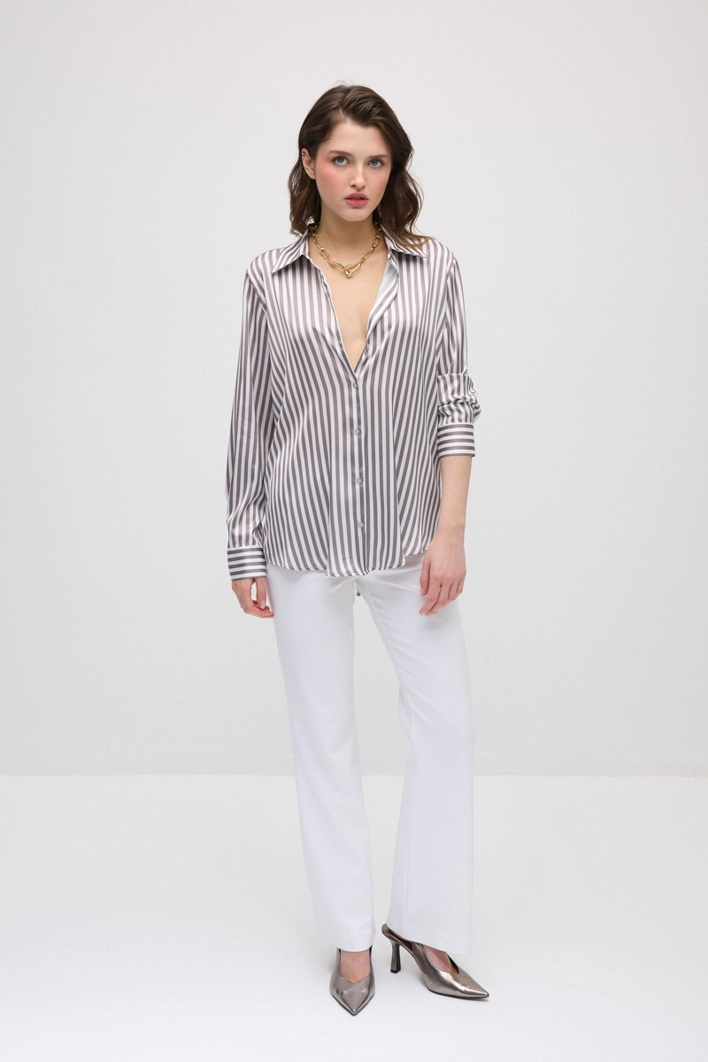 This piece, with its flowing satin fabric and fine stripe pattern, offers an elegant and modern appearance. Its smooth surface provides all-day comfort. The chic and sophisticated style pairs easily with different outfits. Suitable for daily wear and office looks, it is a timeless standout in your wardrobe.