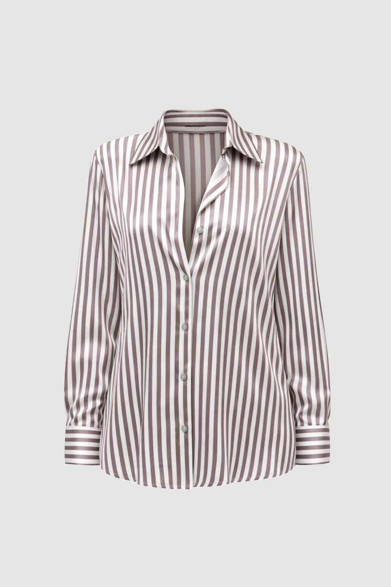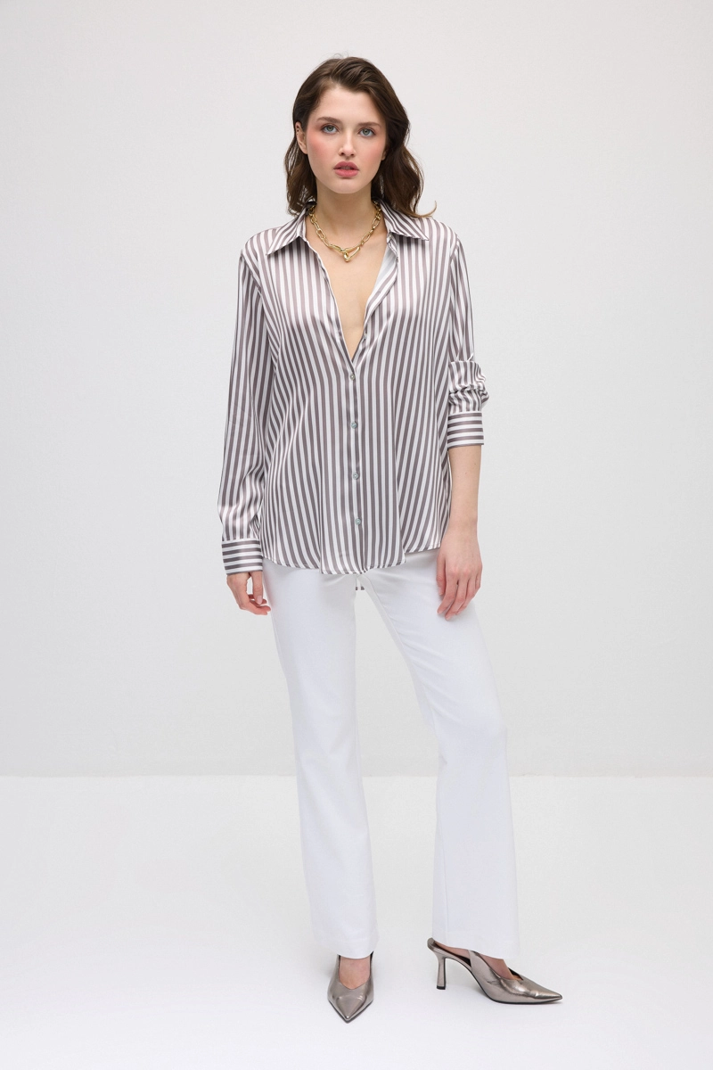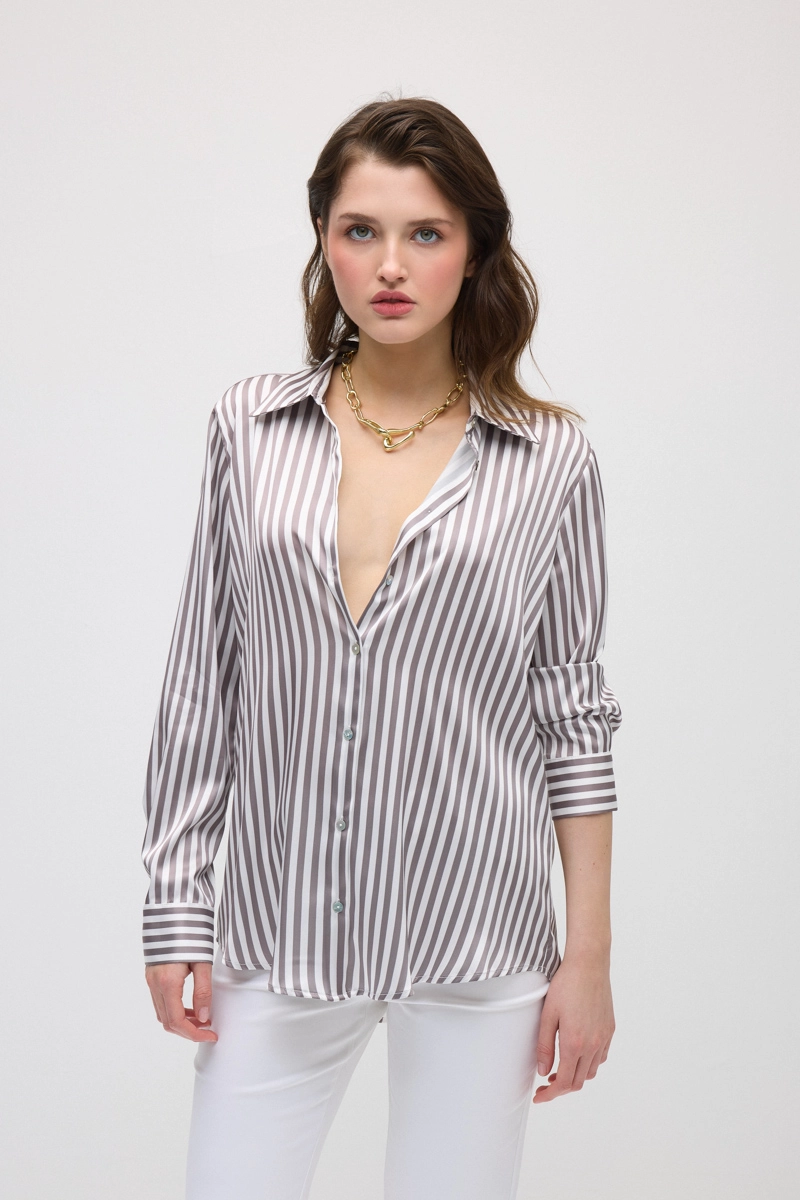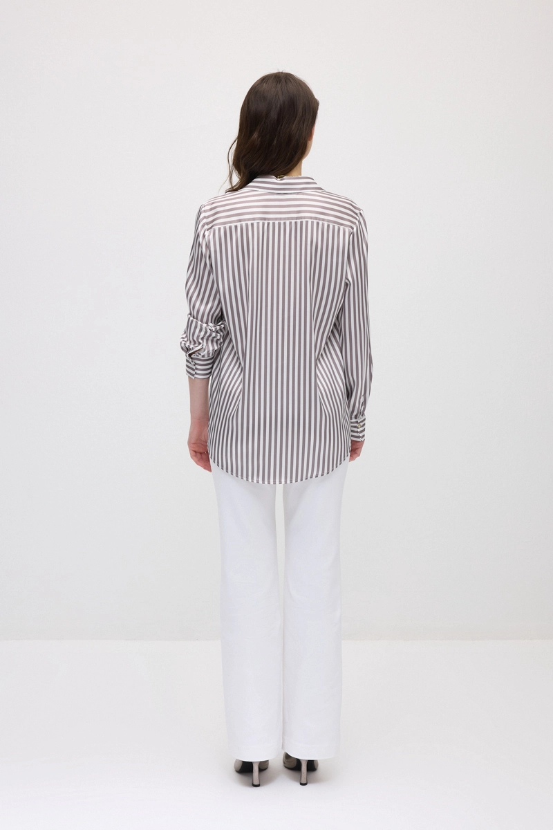 This piece, with its flowing satin fabric and fine stripe pattern, offers an elegant and modern appearance. Its smooth surface provides all-day comfort. The chic and sophisticated style pairs easily with different outfits. Suitable for daily wear and office looks, it is a timeless standout in your wardrobe.