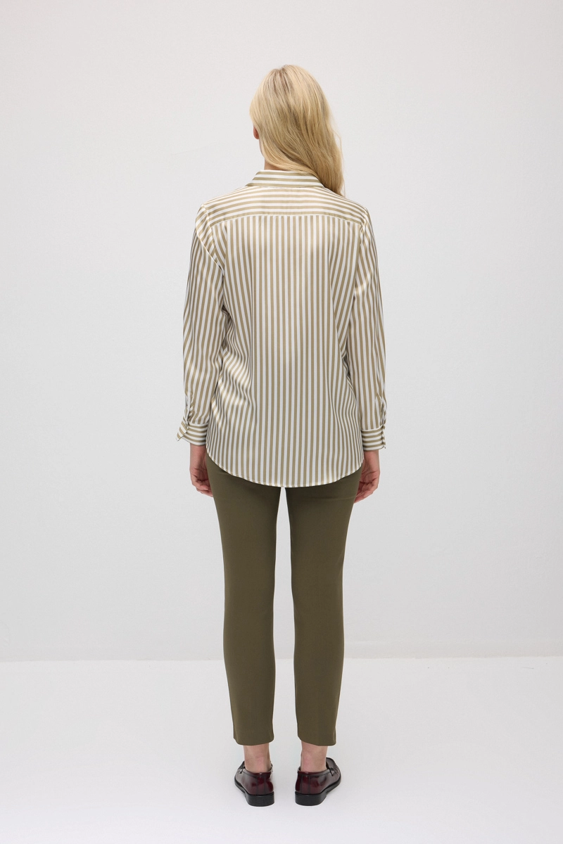 Featuring a flowing satin texture and fine stripe pattern, this piece offers an elegant look. Its smooth, lightweight fabric ensures comfortable all-day wear. The modern and chic design pairs easily with various items, making it suitable for both daily and office outfits. A timeless standout piece in your wardrobe.