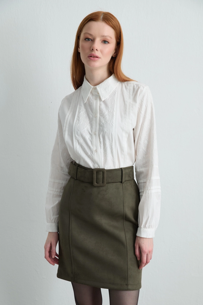 The khaki suede mini skirt, a staple of modern city style, is versatile and practical. Its suede texture gives a luxurious feel, while the short form adds a youthful and dynamic touch. Can be paired stylishly with sweaters, shirts, or jackets.