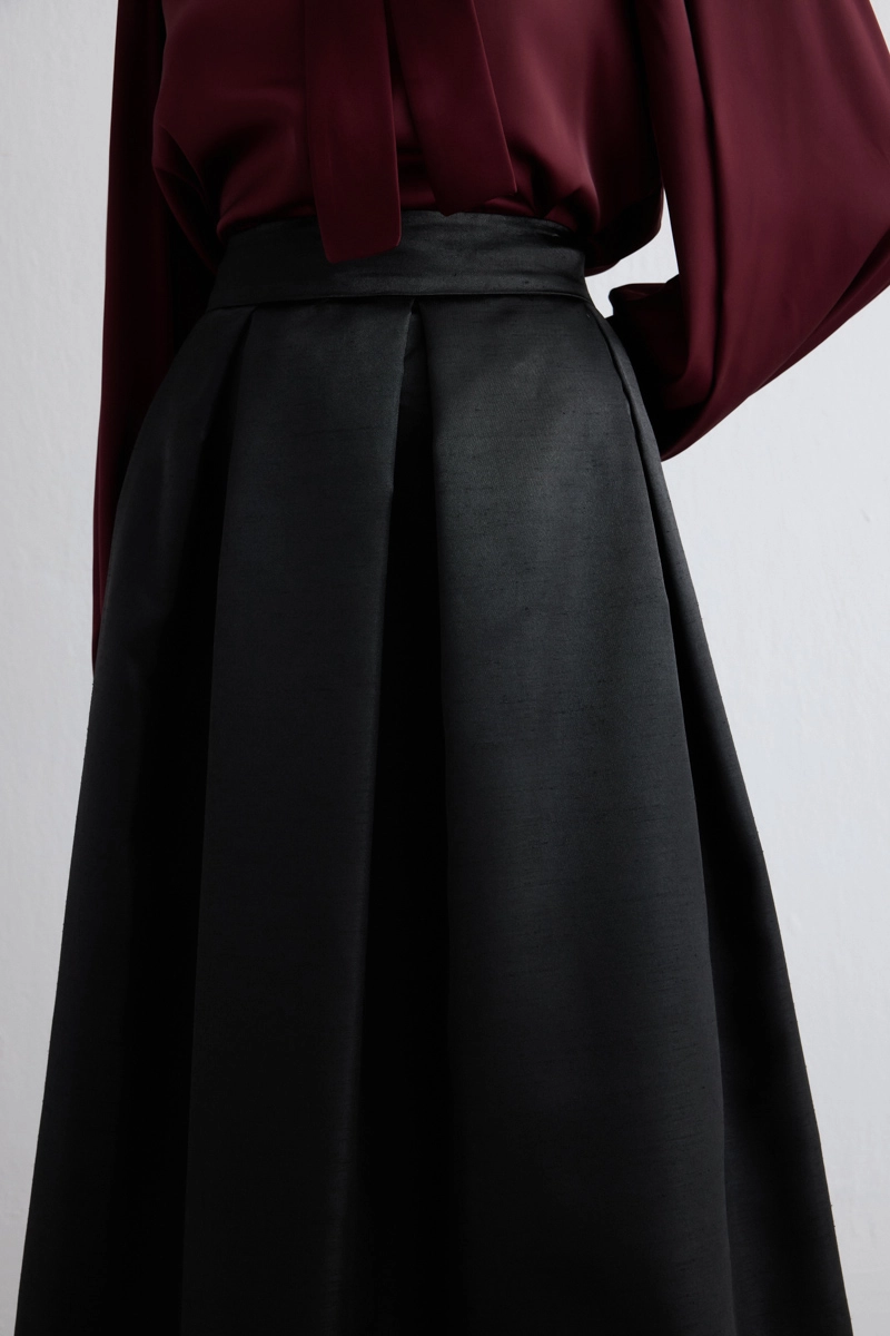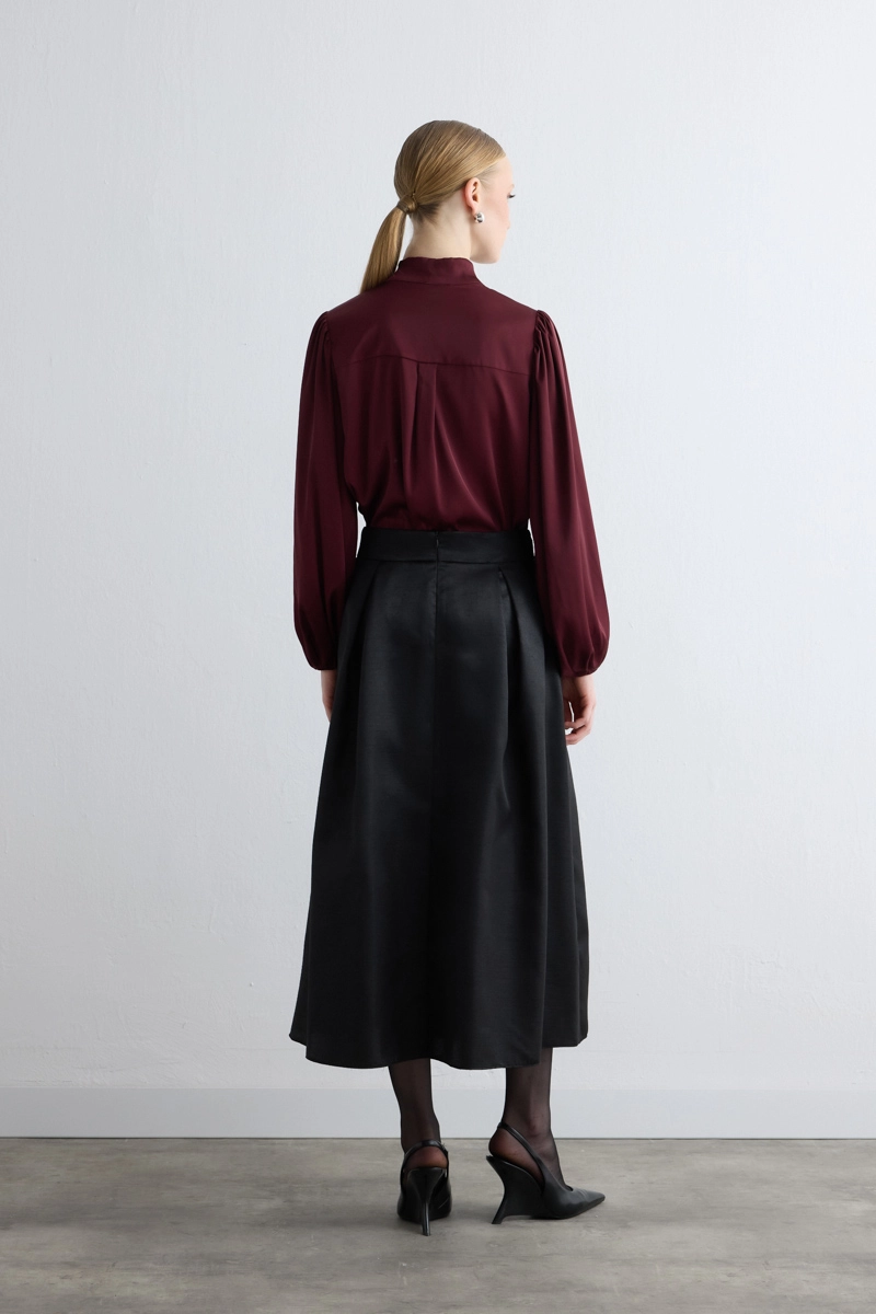 The taffeta texture creates a sparkling effect. The midi length provides a graceful and feminine silhouette. The black tone is suitable for classic and modern combinations. Stands out in both special events and city styles.