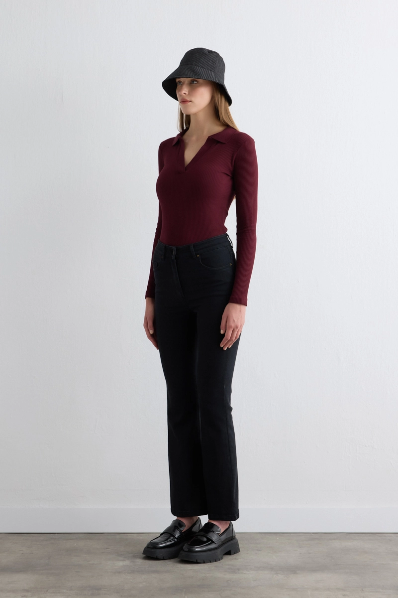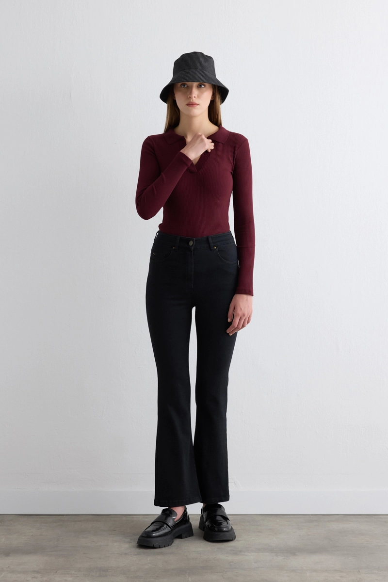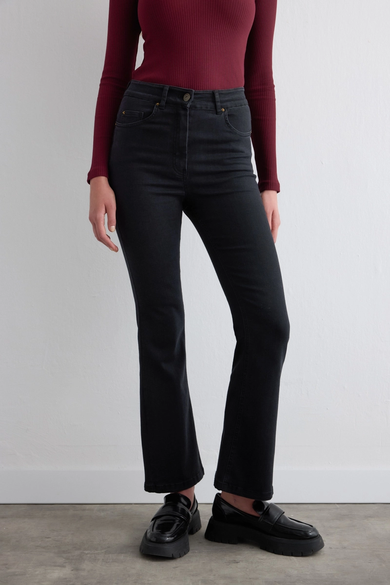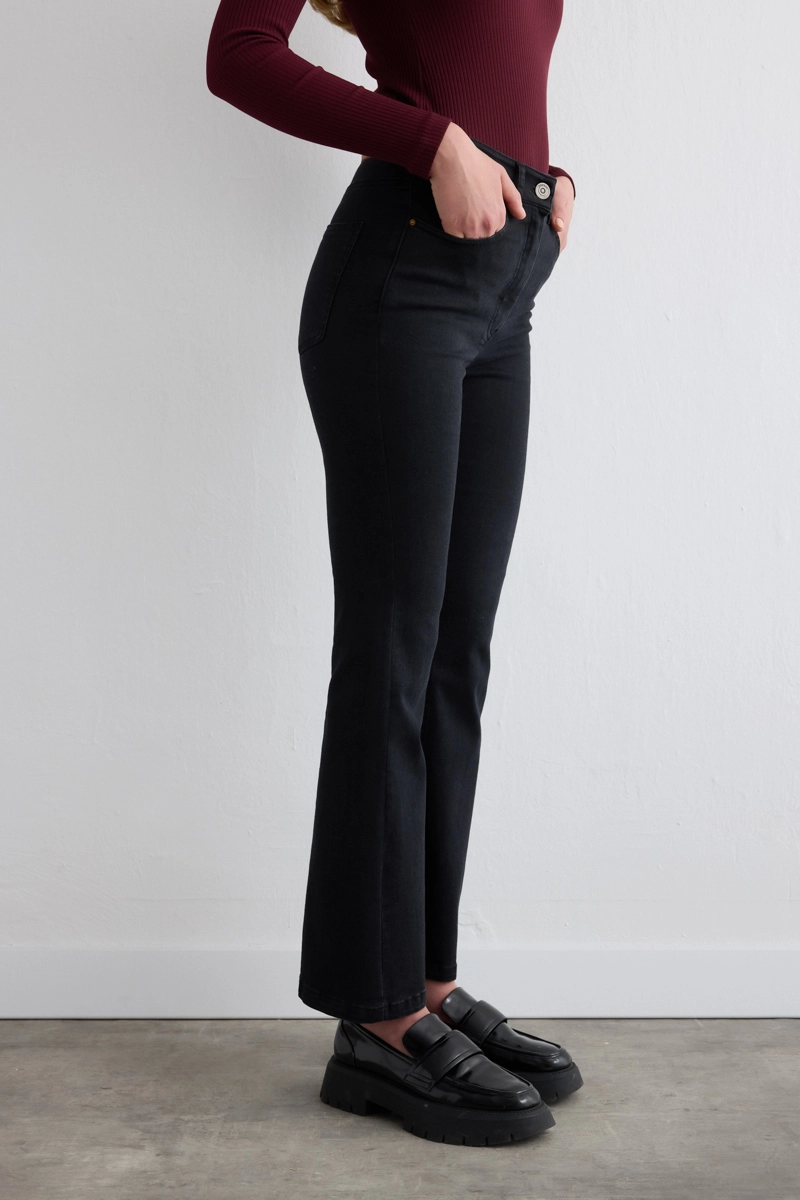 The wide-leg cut creates a modern silhouette. Its flexible structure ensures comfortable wear. The black tone allows for timeless combinations. Combines daily elegance with comfort. High heels add an elegant touch.