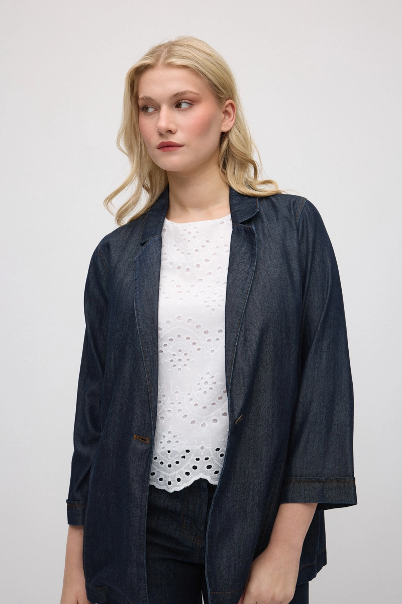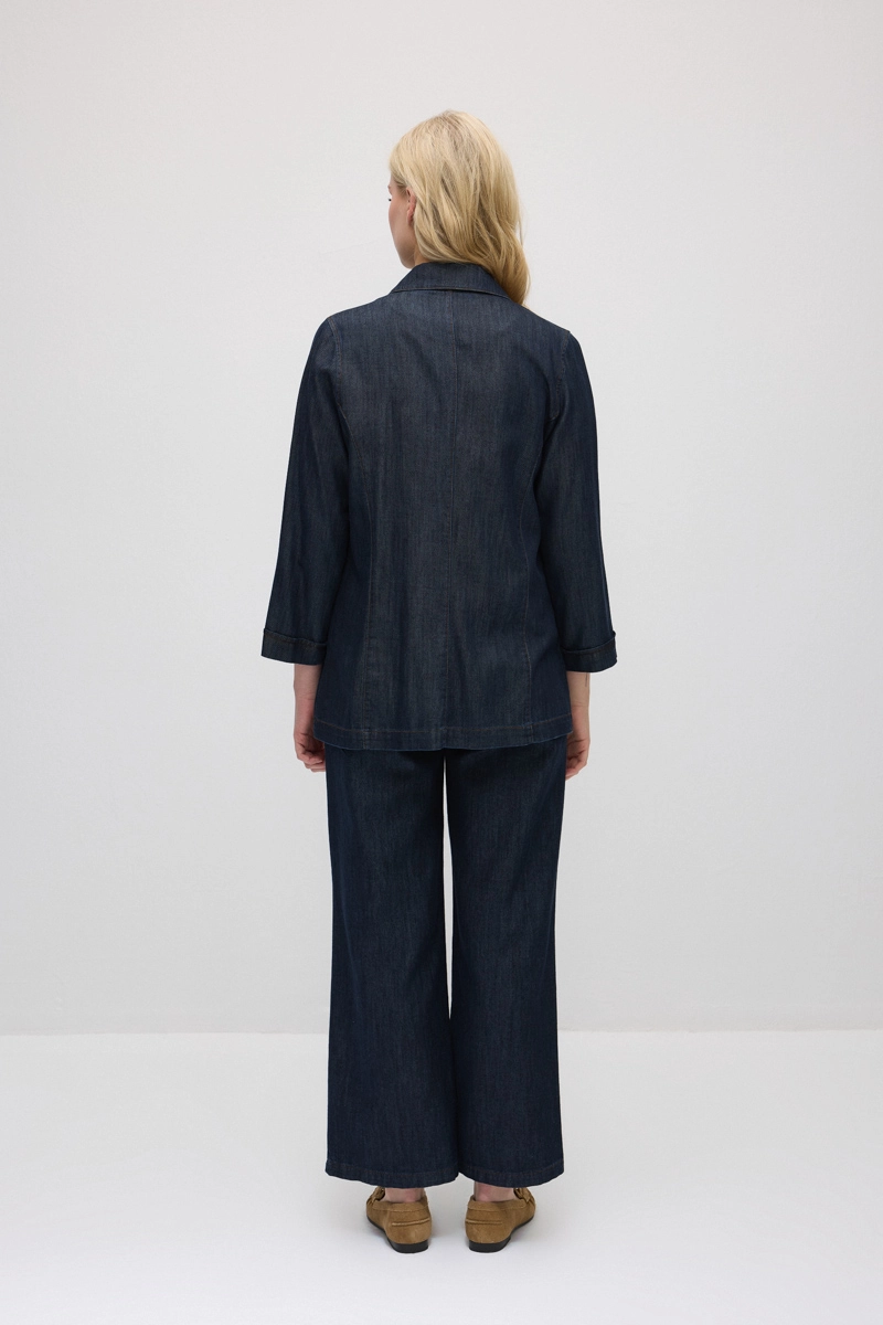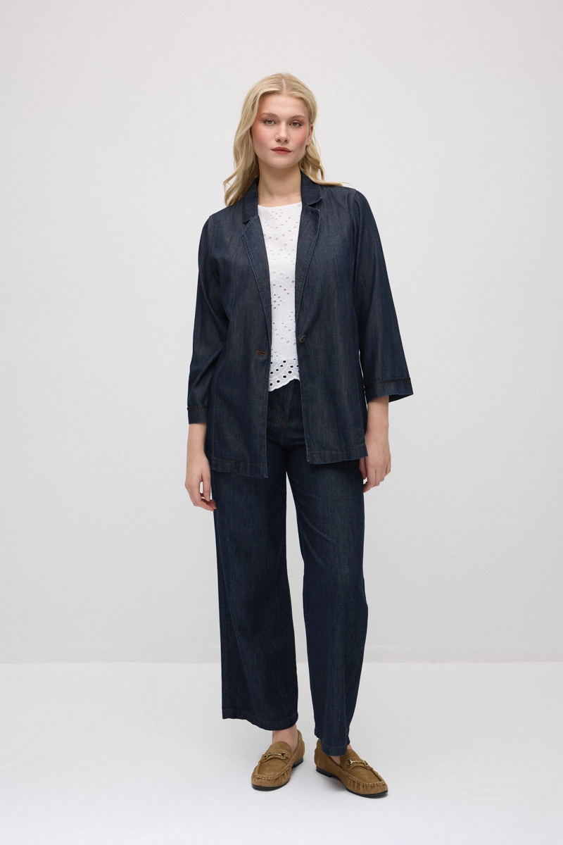 Soft and flowing Tencel denim fabric provides comfortable wear. Its relaxed fit allows freedom of movement all day. The timeless navy tone pairs easily with various outfits. A modern and stylish addition for daily style and a practical piece for transitional seasons.