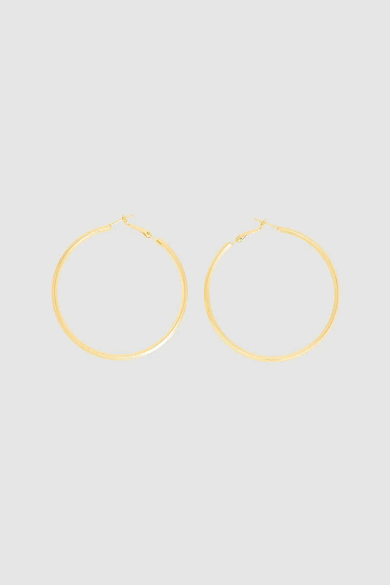 Classic hoop form gains a modern touch. Gold color suits both day and night. Textured surface offers distinctive elegance. Stands out with elegant yet bold style.