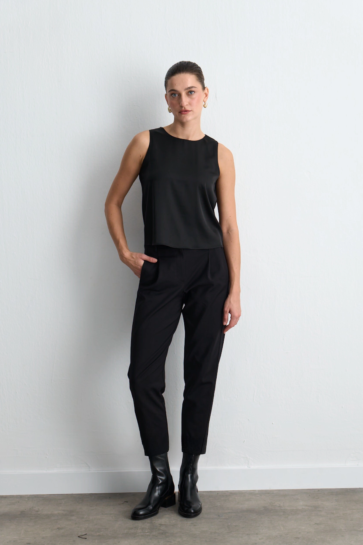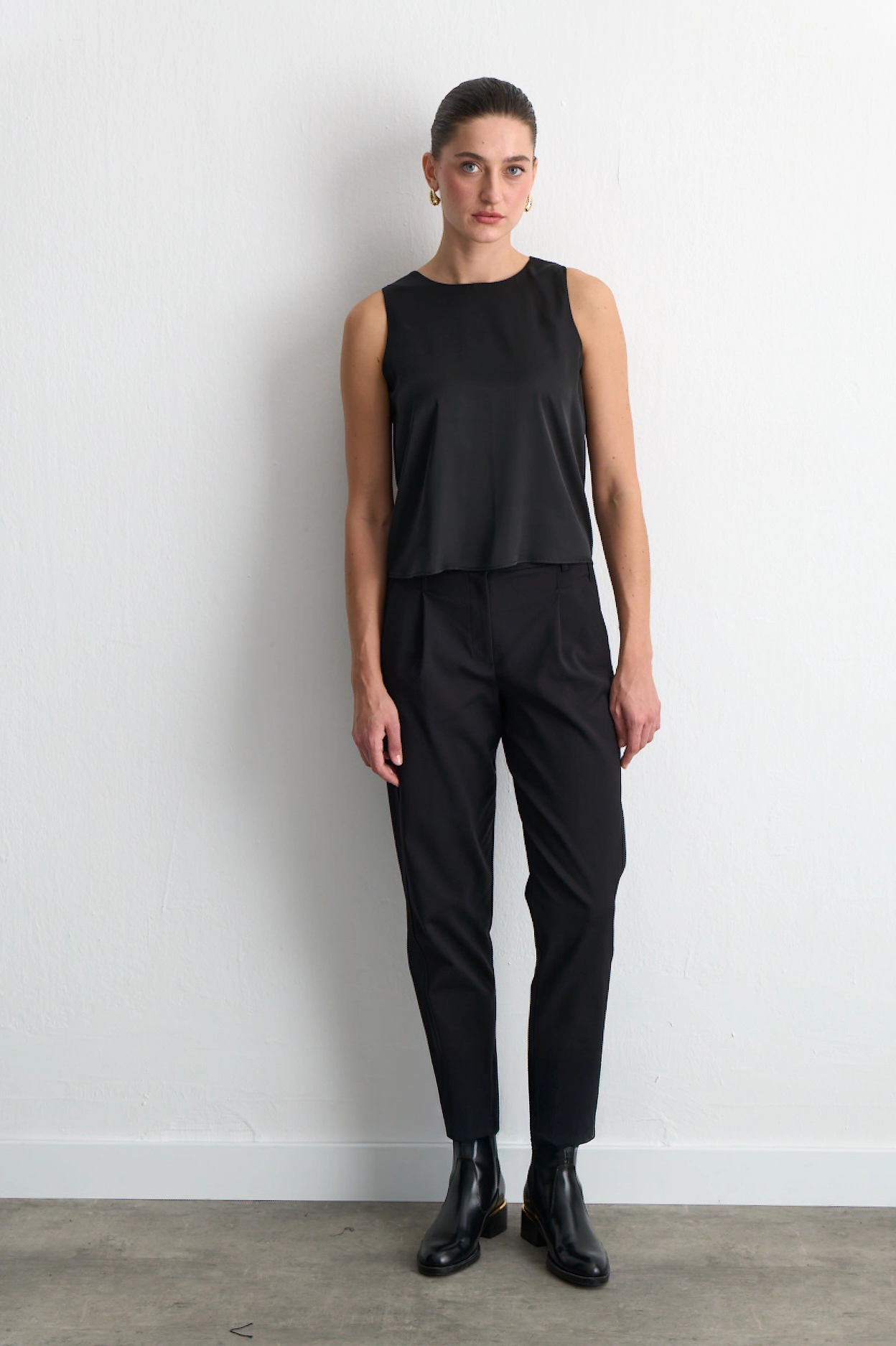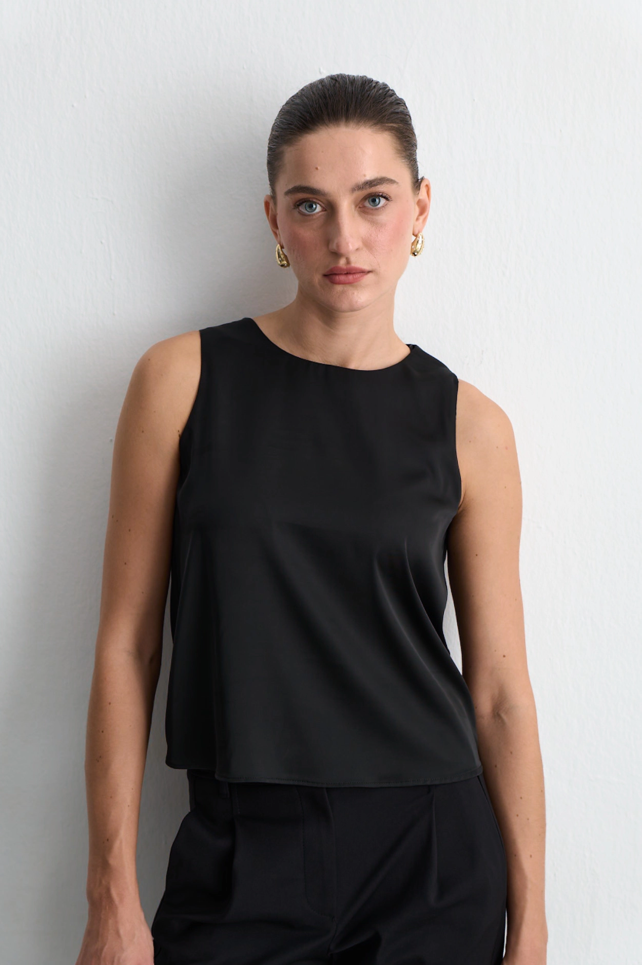 The black tone provides a classic and versatile style. The satin fabric gives a subtle shine and elegant appearance. Thick straps ensure comfortable wear. The minimal cut creates a modern and stylish look. Completes elegance from daily outfits to special events.