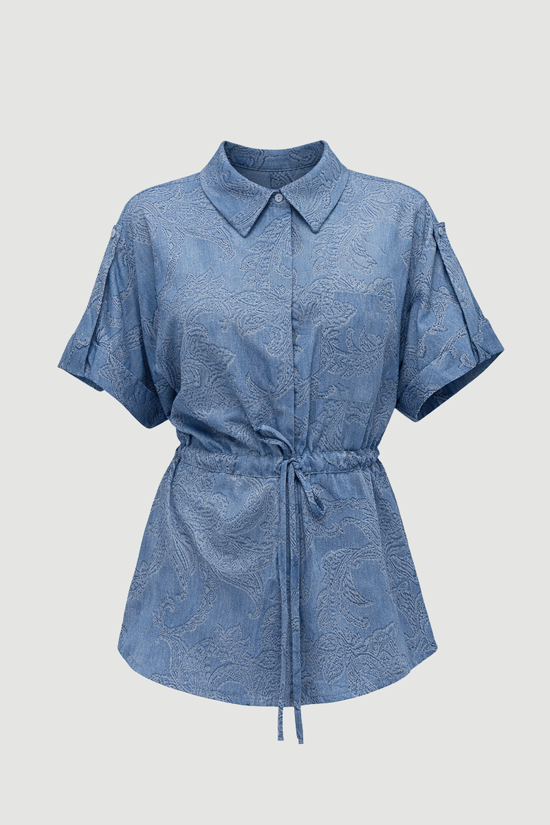 Viscose fabric provides a lightweight and flowing structure. Self-patterned texture adds graceful movement to the design. Waist tie detail elegantly emphasizes the silhouette. Blue tone creates a fresh and chic style.