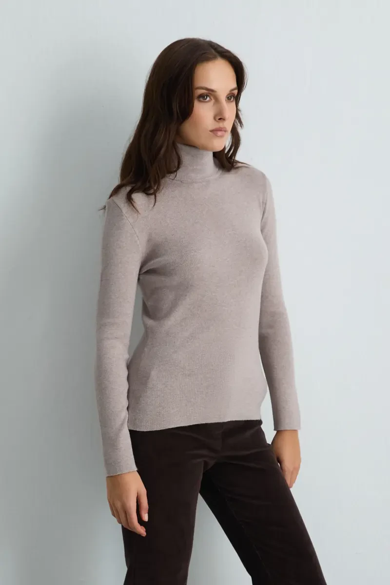 Turtleneck knit in fawn offers a simple and chic look while keeping warm with its soft fabric. Suitable for daily wear, providing a minimal and comfortable style. Can be worn alone or layered for a stylish choice.