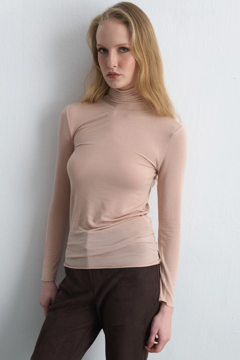 The cashmere blouse in a pastel powder tone adds a romantic and elegant touch with its turtleneck design that combines sophistication with a modern line. Its light and soft texture ensures comfortable wear. Can be easily paired with jeans or skirts for daily outfits. An ideal wardrobe staple completed with minimal accessories.