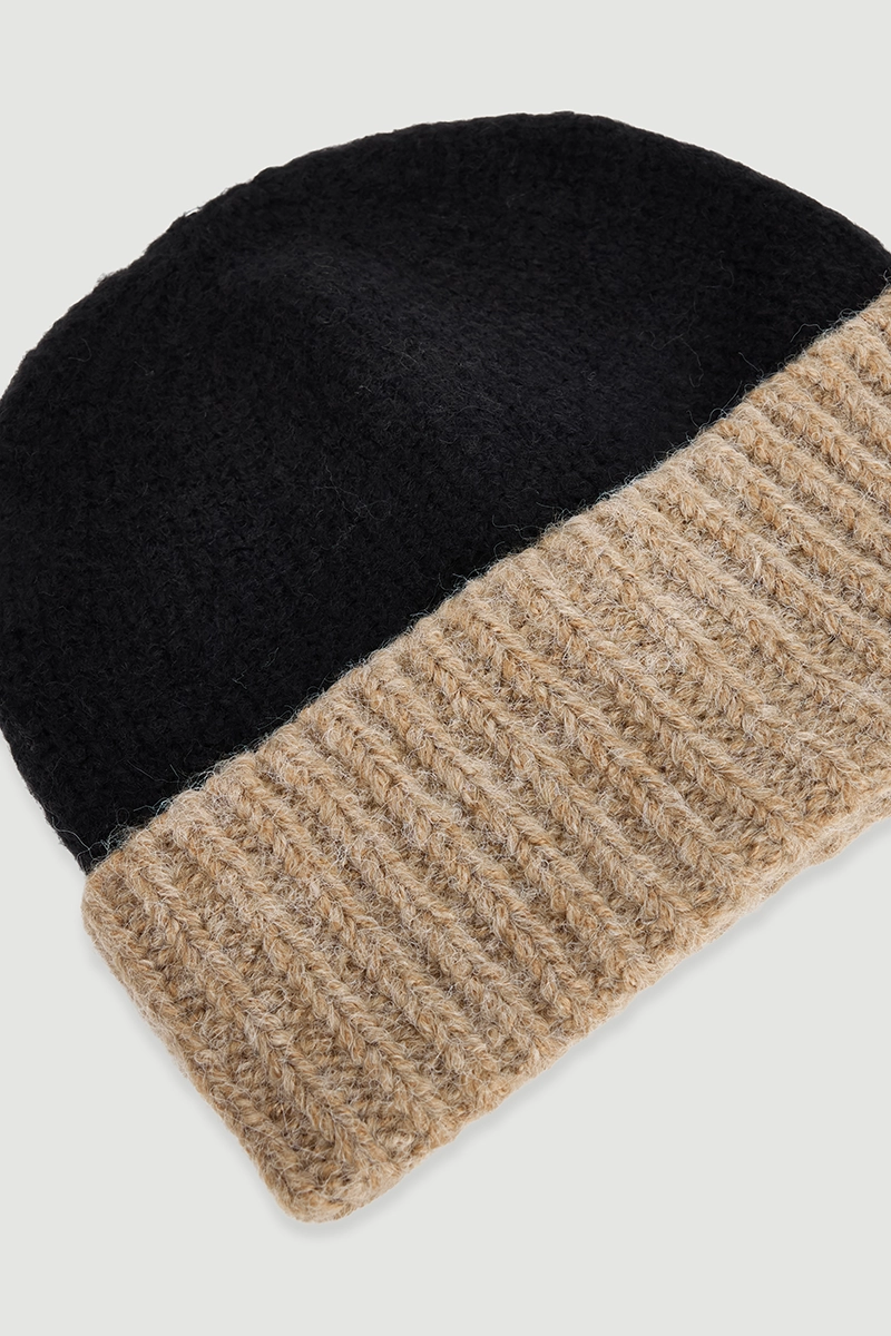 Its black tones create a contrasting and modern look. The soft texture provides comfortable wear. The thick knit structure keeps you warm. Its two-tone design adds movement to simple outfits. It becomes a functional accessory that completes everyday elegance.