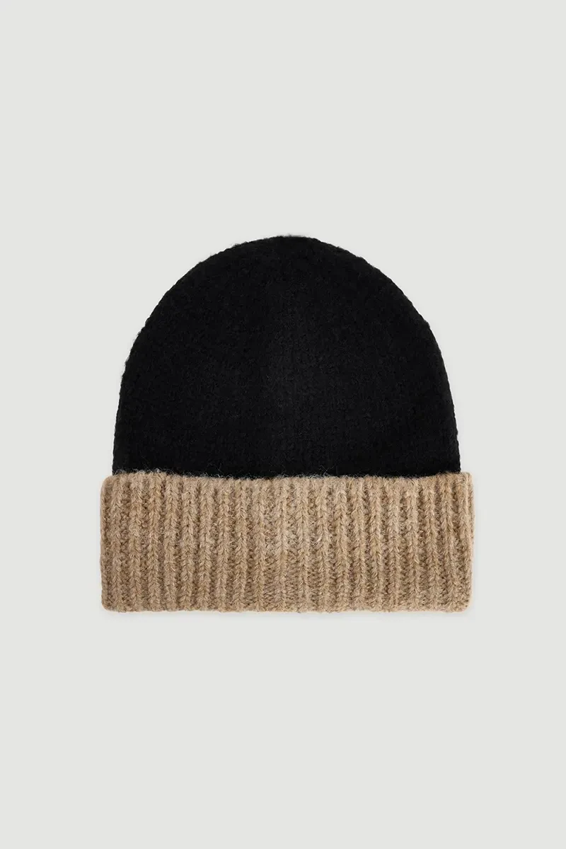 Its black tones create a contrasting and modern look. The soft texture provides comfortable wear. The thick knit structure keeps you warm. Its two-tone design adds movement to simple outfits. It becomes a functional accessory that completes everyday elegance.