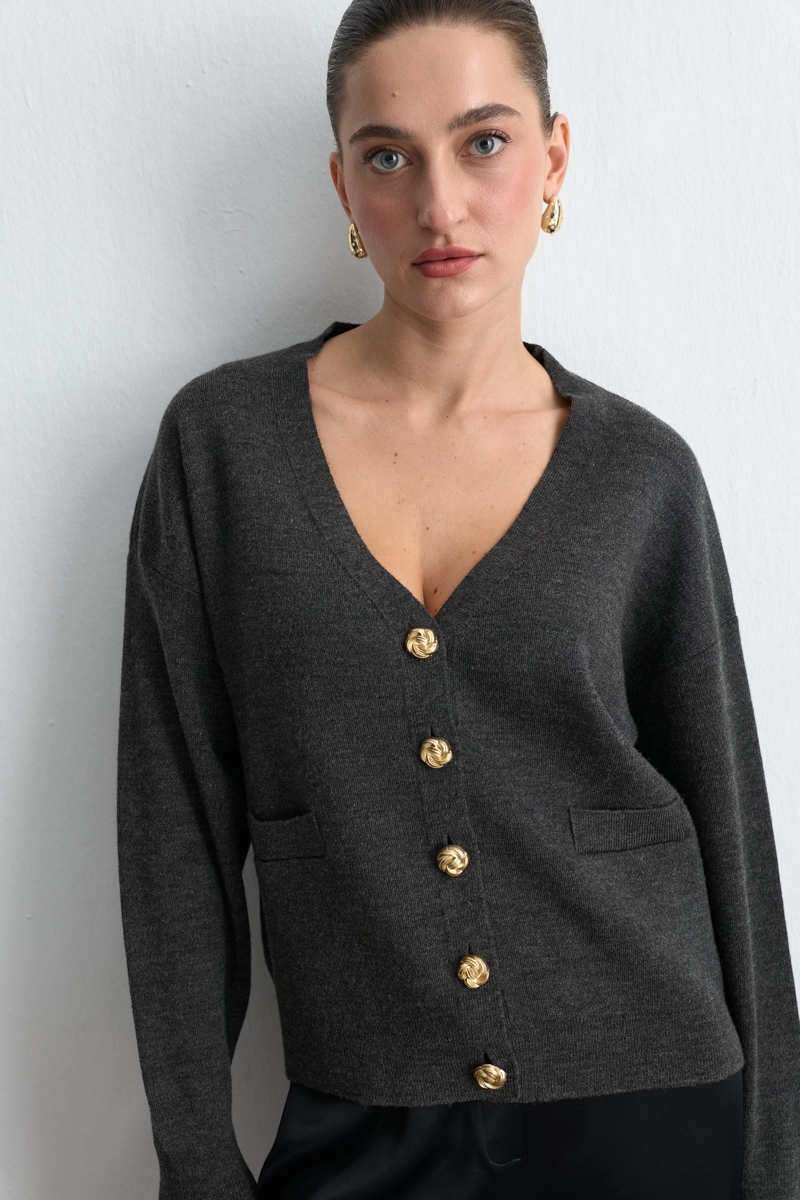 Its smoke-gray tone brings a modern and sophisticated look. The woolen texture offers warmth and comfort. The V-neck cut creates a feminine elegance. The button detail completes the classic style. It is the key piece of simple chic for daily and office outfits.