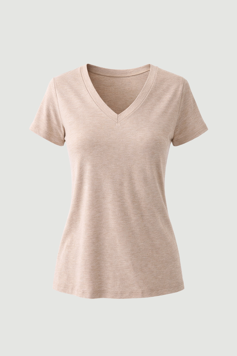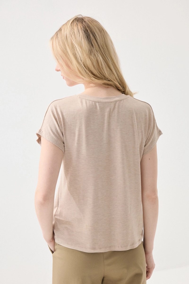 This t-shirt, made from melange bamboo fabric, offers a natural and soft feel while featuring a modern look with its V-neck detail. Its breathable structure ensures a fresh feel throughout the day. Its lightweight and flexible texture adapts to the body, providing comfort. It is set to become one of the essential pieces of your daily outfits. It can be easily paired with different bottoms.