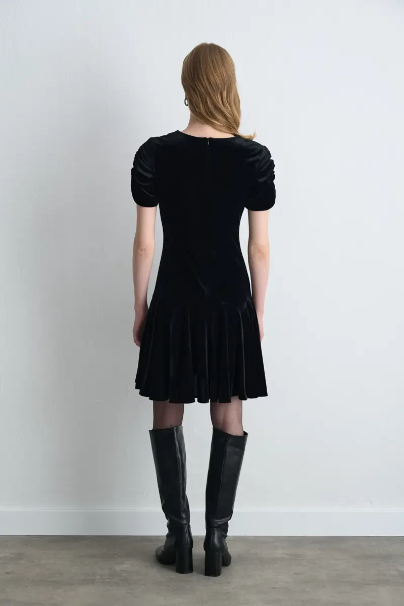 The shimmer of velvet creates a feminine stance. The mini length adds a modern and energetic vibe. The V-neck cut forms a delicate neckline. The black tone reflects timeless elegance. A striking option for special events and evening styles.