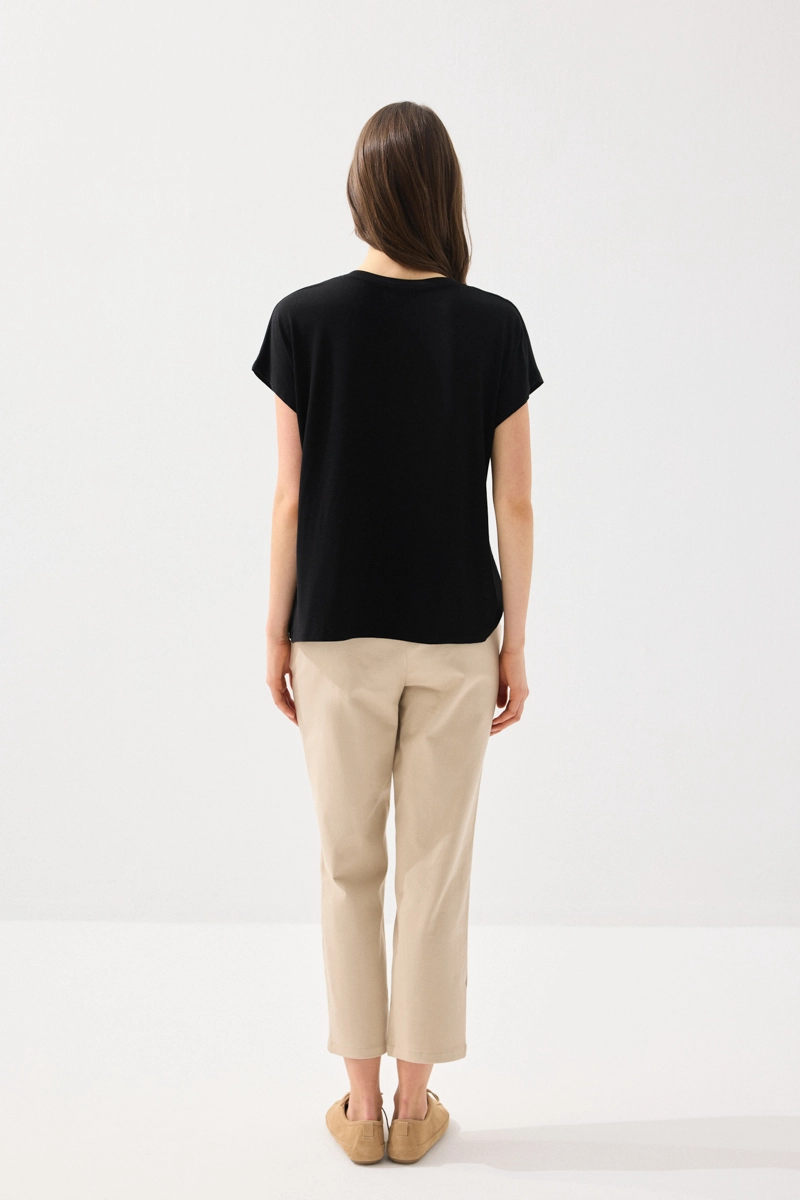 This bamboo t-shirt, featuring a V-neck detail and relaxed fit, offers a modern look while ensuring all-day comfort with its soft texture. Its breathable structure provides a fresh feel. Its lightweight and flexible structure adapts to the body. It is set to become one of the essential pieces of your daily outfits. It can be easily paired with different bottoms.