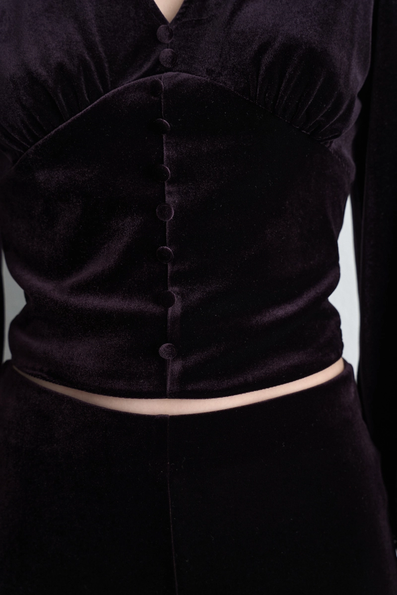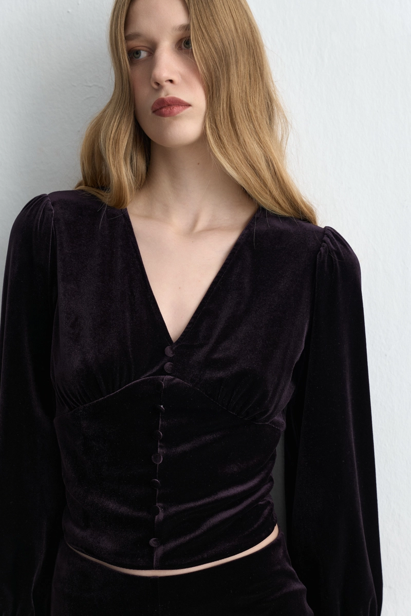 The plum tone reflects noble elegance. The velvet fabric provides luxurious shine and softness. The V-neck cut creates a feminine silhouette. The flowing form offers both comfort and style. Stands out as a remarkable piece for daily elegance or special occasions.