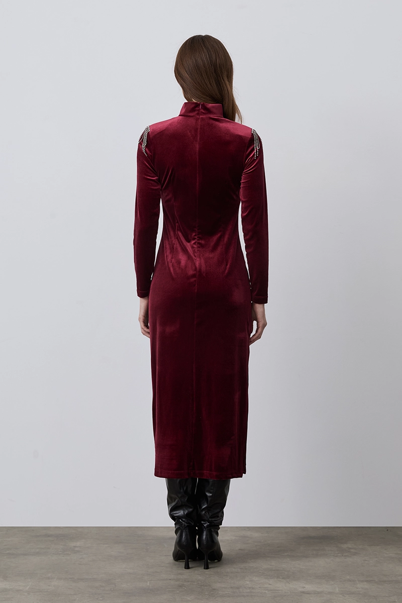 The burgundy velvet evening dress with shoulder accessory details provides a sophisticated look with its deep color and elegant touches, ideal for evening outfits.