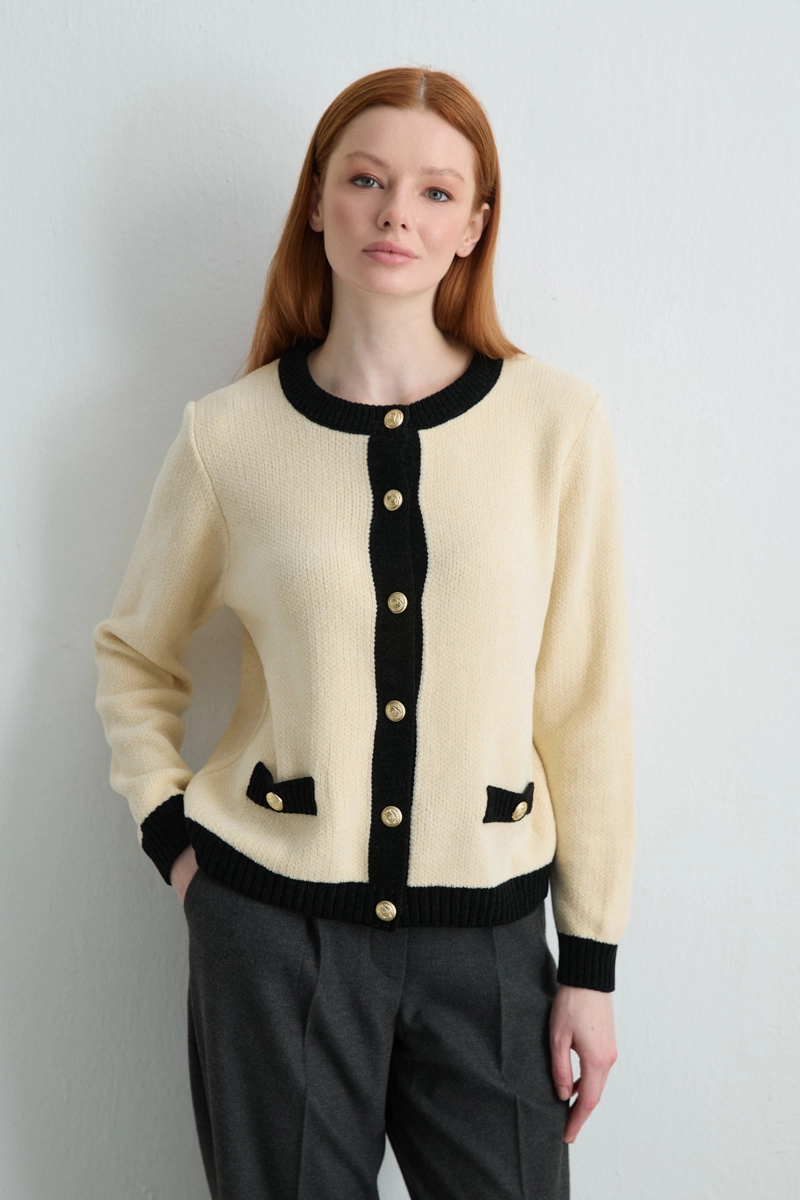 Ecru cardigan with velvet-trimmed details provides a sophisticated look. Its soft and warm fabric, combined with a relaxed fit, ensures comfort all day. Stands out in both classic and modern outfit combinations.
