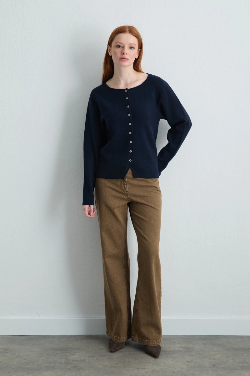 Navy viscose knit cardigan combines classic knit texture with stylish design. Its relaxed fit offers comfort for daily wear, while its sophisticated look complements layered outfits.