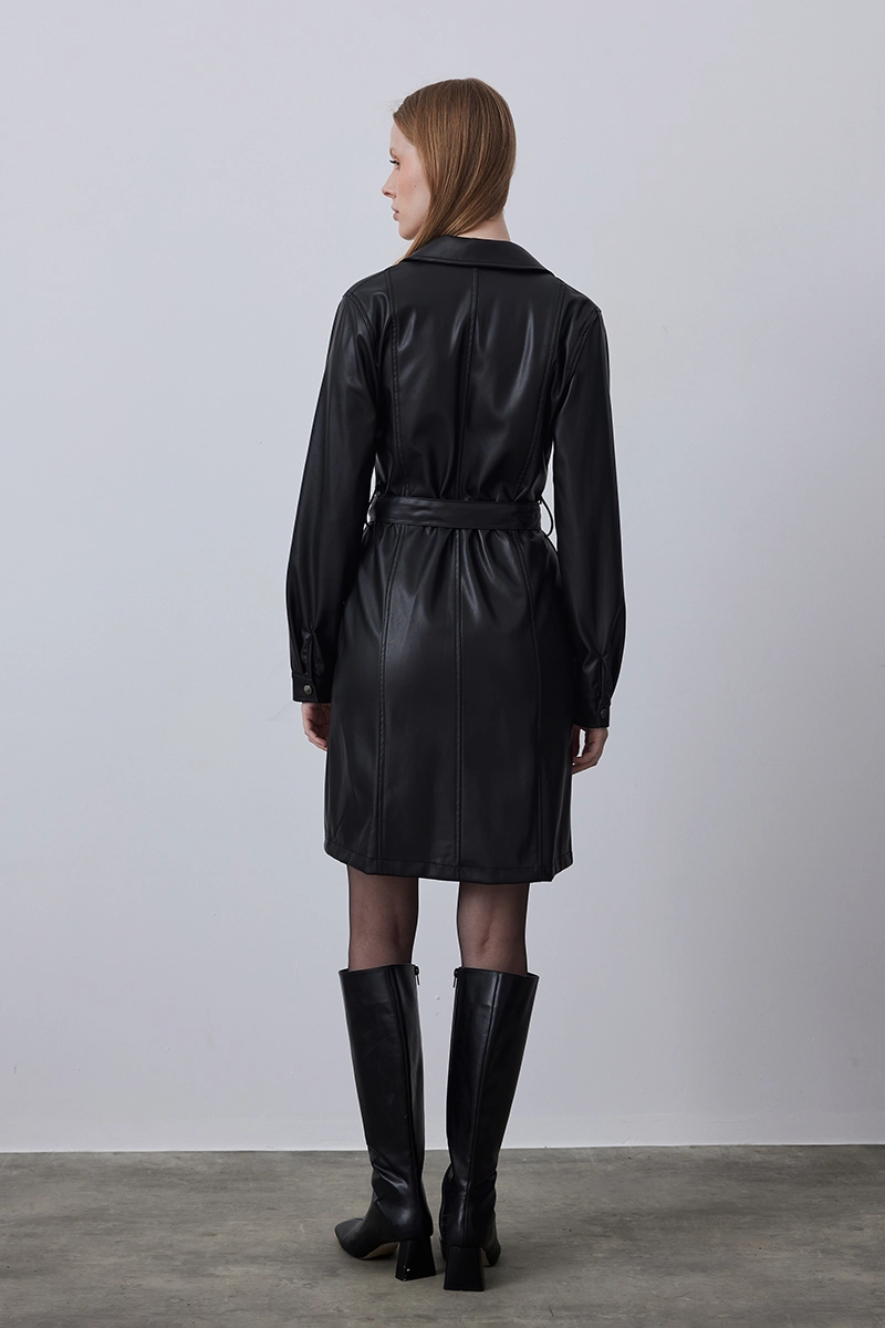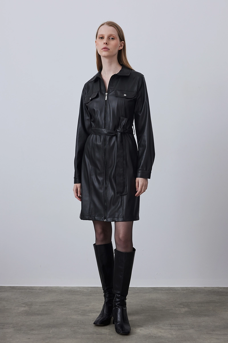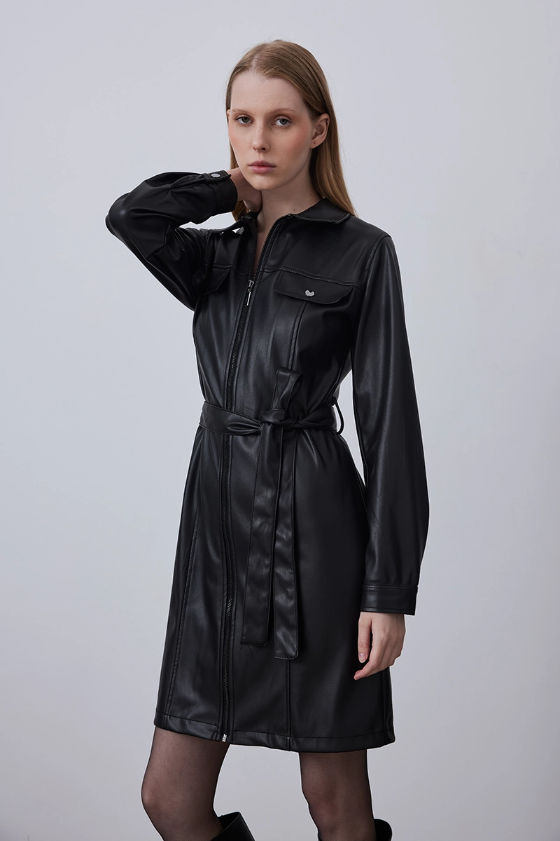 The black waist-belted leather dress features a strong design that emphasizes a feminine silhouette, versatile for both casual city style and evening outfits.
