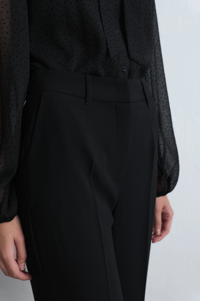 This crepe pants, with a stylish and modern appearance, create an elegant silhouette with their wide-leg cut. Their black color is timeless and suitable for all seasons. Pair with heels for evening elegance or flat shoes for daily style. Complements both minimalist and bold outfits.