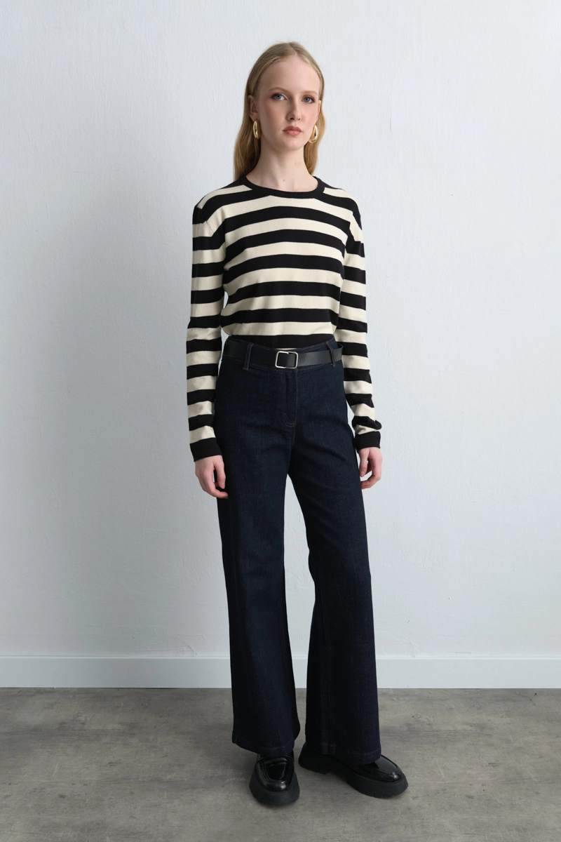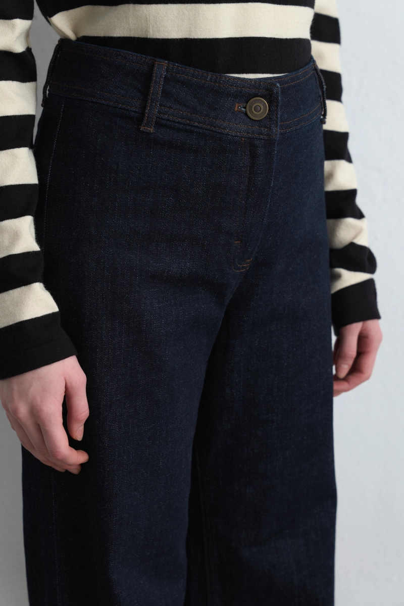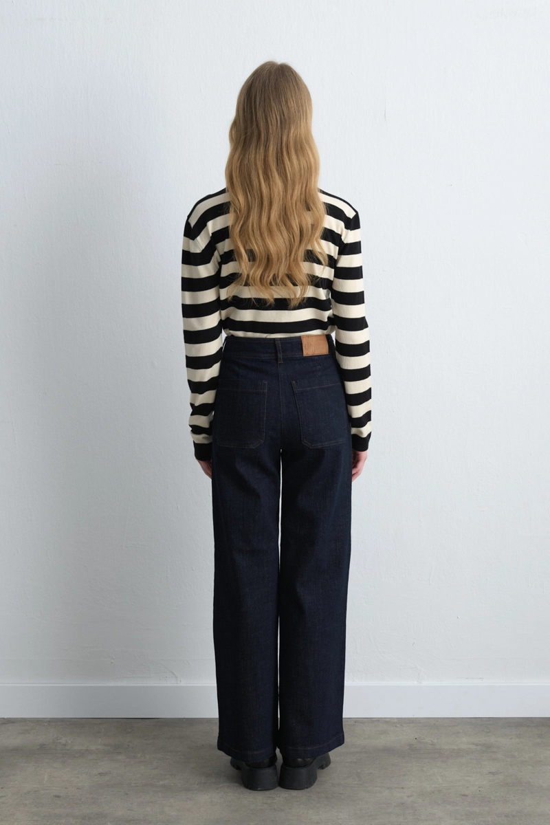 These navy wide-leg denim pants combine comfort and style, making them ideal for daily wear. Provide comfortable movement while creating an urban style with their modern cut. Can be paired with sneakers or heels.