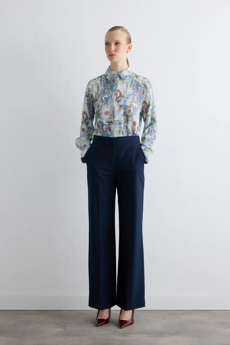 Its flowing form offers an elegant silhouette. Wide-leg cut gives a modern and unique style. Glitter striped pattern adds a shimmering effect. The navy tone complements both day and night outfits. Comfortable fit ensures all-day wear.