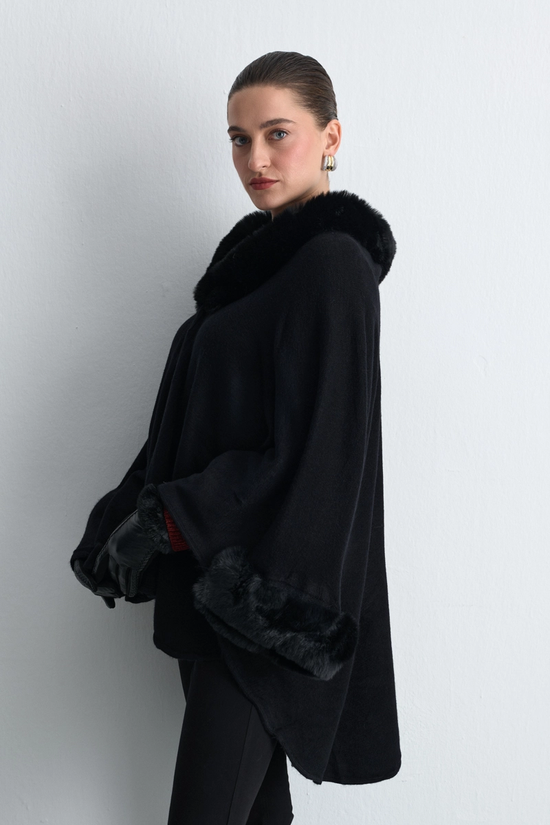 The wool texture provides warmth and comfort. Fur details create a modern and luxurious style. The black tone offers a classic and noble presence. The cape form creates a unique silhouette that highlights your style. A stylish and functional choice in winter outfits.