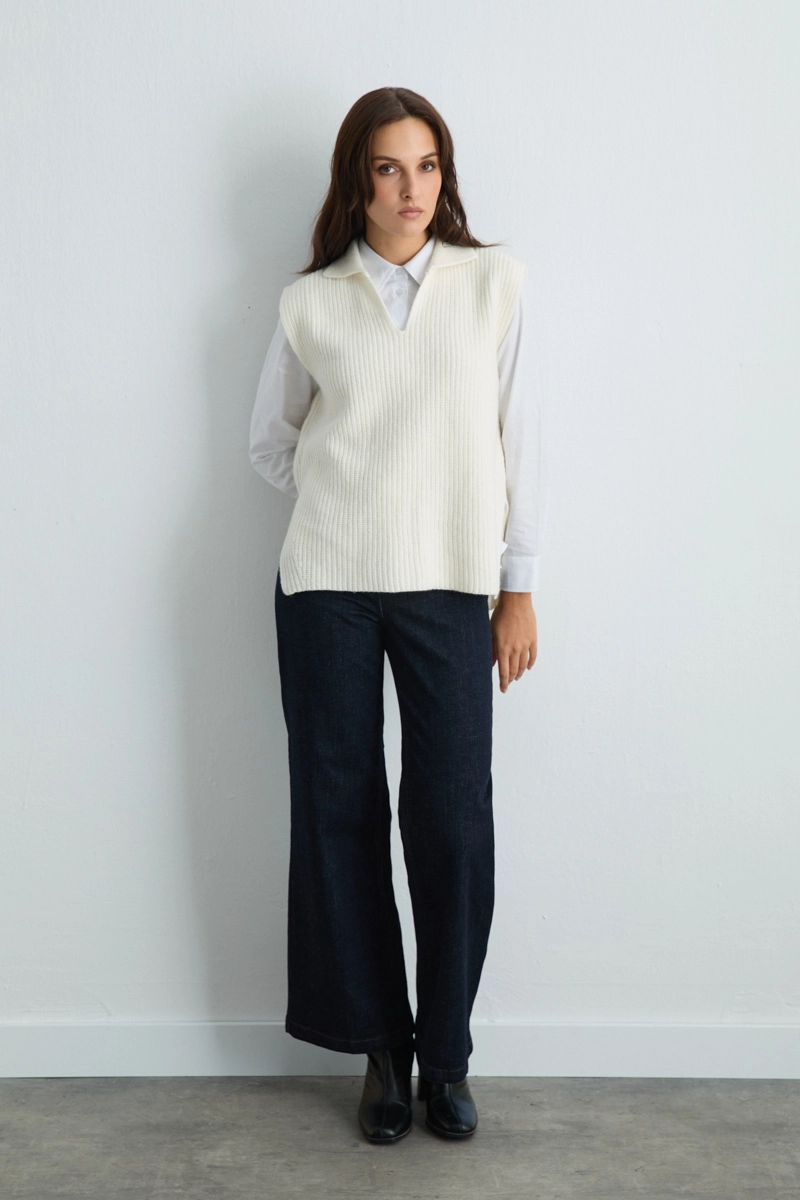 Ecru wool vest offers a minimal and elegant look with comfortable wear all day. Can be paired with jeans, trousers, or skirts to create a versatile style.