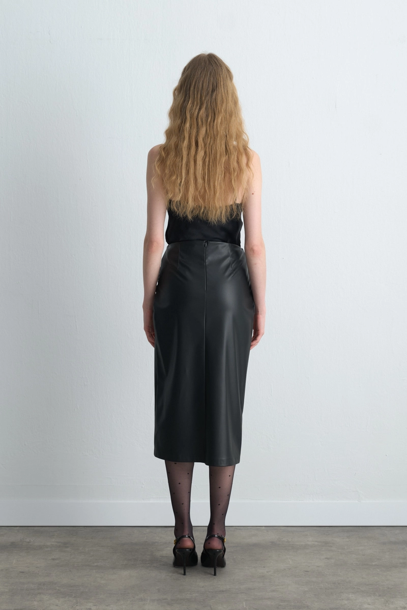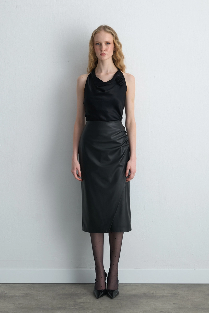 The Wrap Detail Creates A Modern And Elegant Silhouette. The Leather Texture Adds Bold Style. The Black Tone Adapts Easily To Different Looks. Suitable For Both Special Events And Daily Chic.