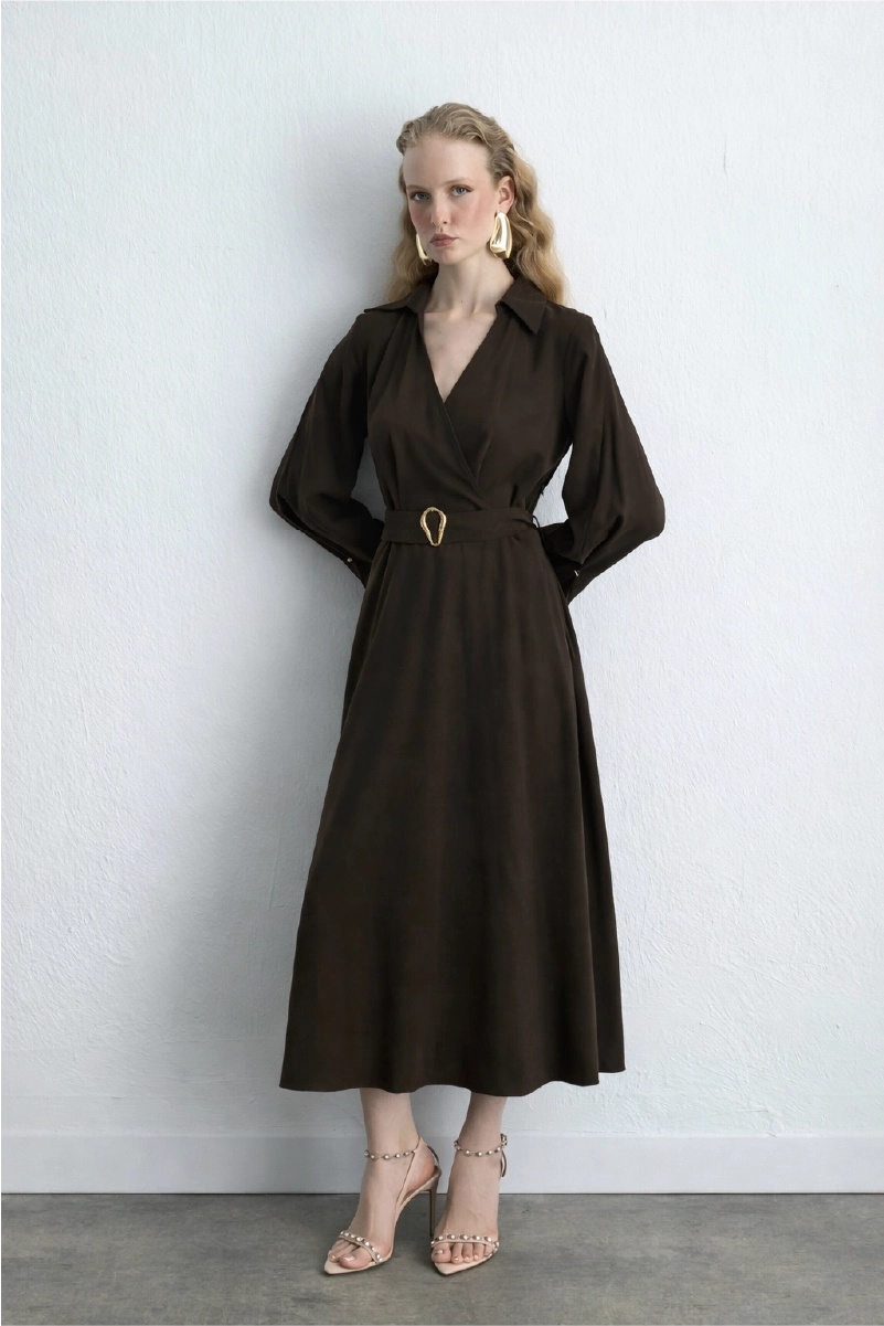 Its Natural Lyocell Fabric Is Breathable. The Wrap Cut Creates An Elegant Silhouette While Prioritizing Comfort. The Brown Tone Provides A Natural And Chic Look. Suitable For Both Daily Chic And Special Invitations.