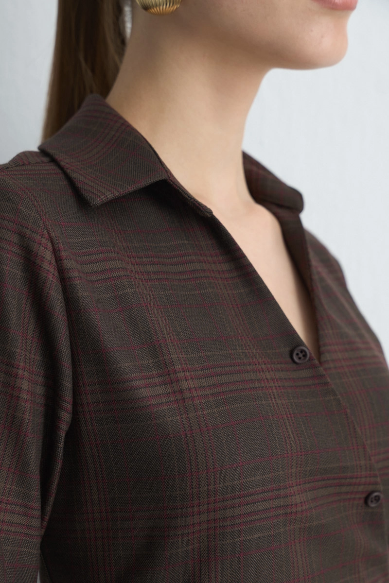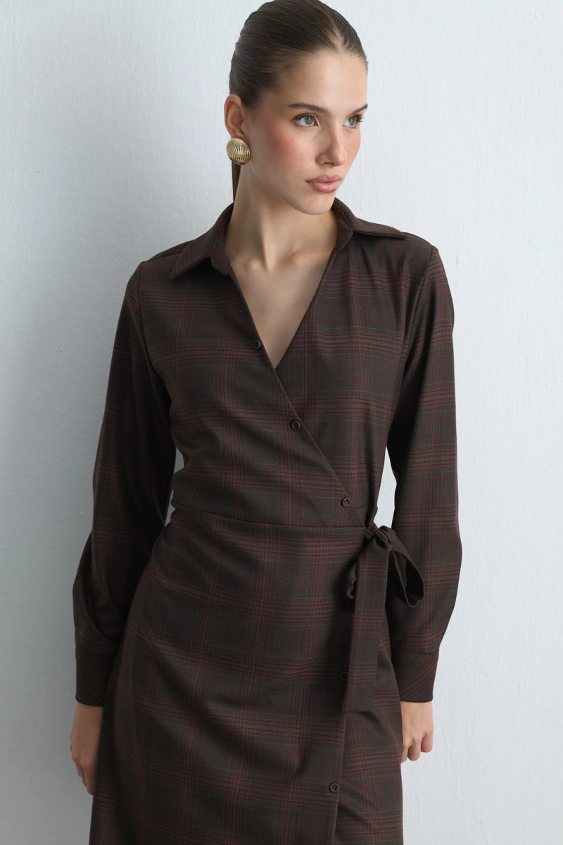 Its Classic Checkered Pattern Creates A Nostalgic Touch. The Wrap-Around Cut Provides A Feminine Silhouette While Prioritizing Comfort. The Brown Tones Offer Natural Harmony For Fall And Winter Outfits. When Paired With Boots And Belts, Elegance Is Enhanced.