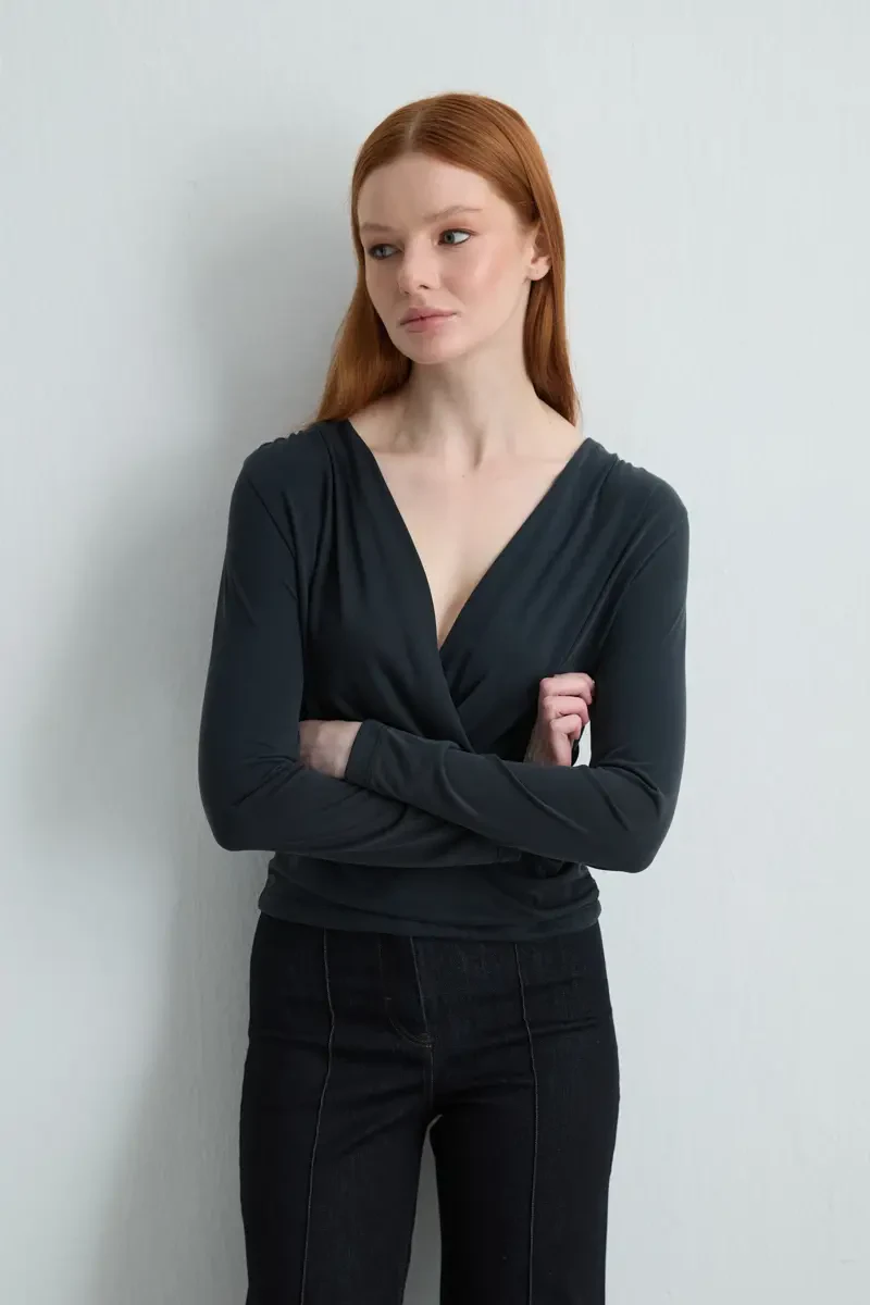 Black modal knit blouse with a graceful wrap design offers a feminine silhouette, gently accentuating body lines. Soft fabric provides all-day comfort, while its simple design works well for both office and evening outfits.