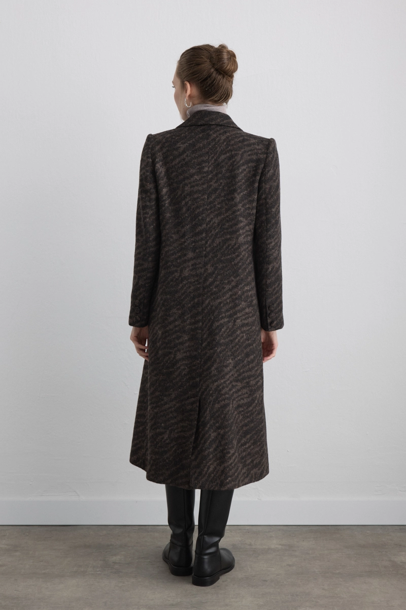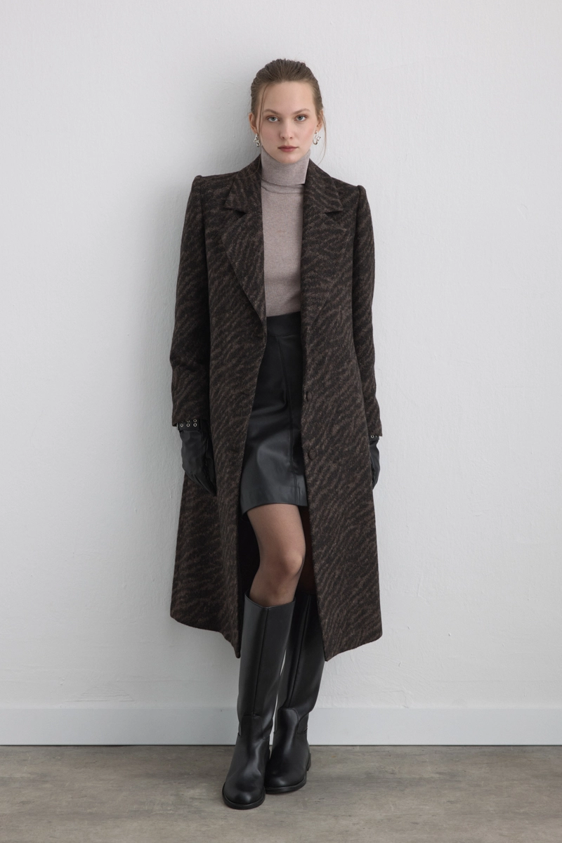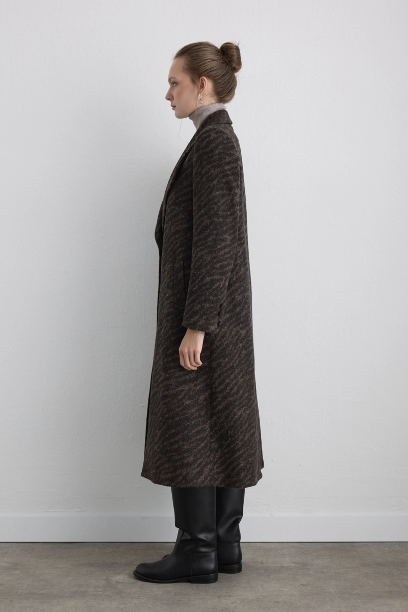 The design featuring a zebra pattern creates a bold and modern statement. Its woolen texture provides warmth, while the pattern enhances urban style. When paired with minimal accessories, it delivers a striking look.