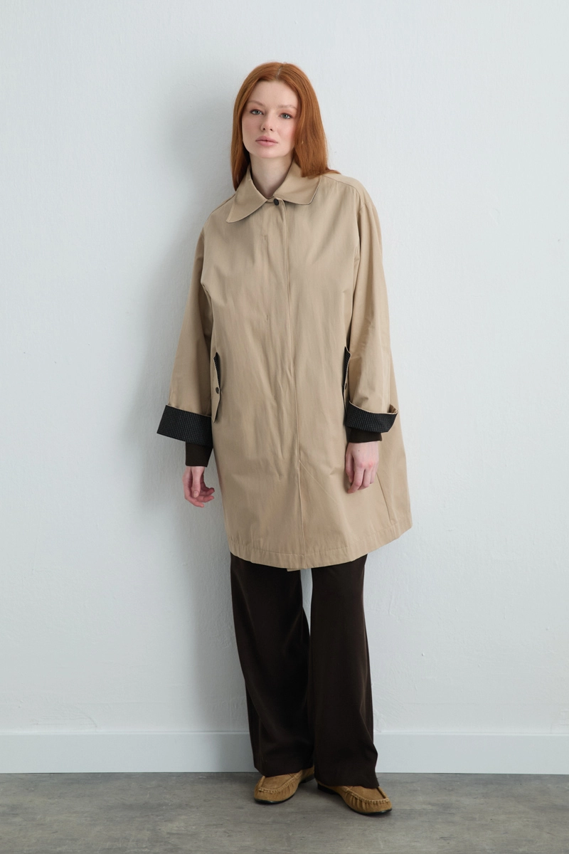 Bej tonundaki trençkot, fermuar detayıyla modern ve pratik bir stil sunar. Klasik kesimi sayesinde farklı kombinlerle kolayca uyum sağlar. Hafif koton dokusu, geçiş mevsimlerinde konforlu bir kullanım sunar ve günlük stilinize sofistike bir dokunuş katar.