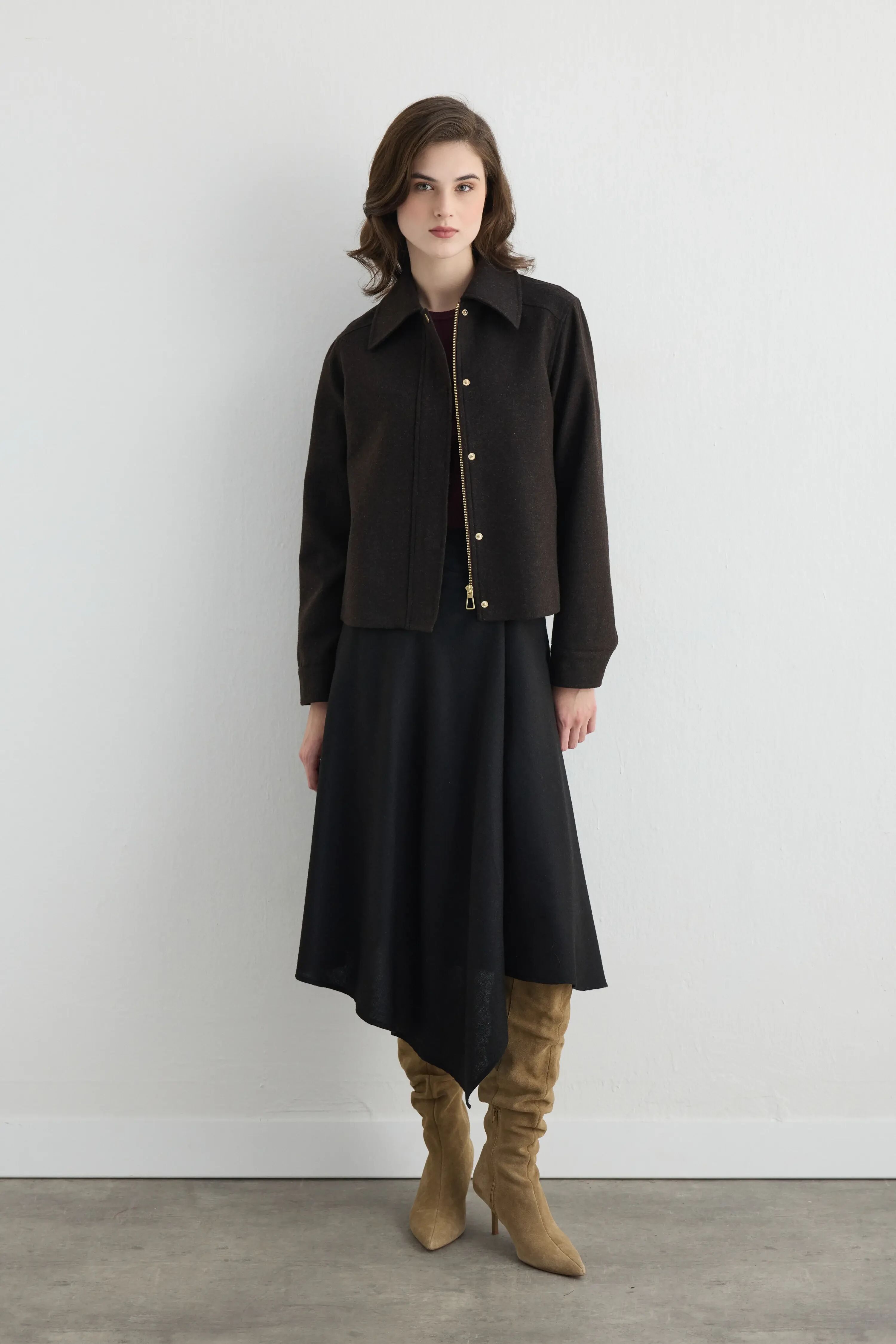 Fermuarlı Yünlü Kaşe Ceket & Anvelop Kesim Asimetrik Etek - Kahverengi Takım