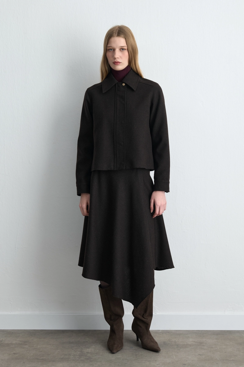 Kahverengi tonu ile doğal ve sıcak bir görünüm sunar. Yünlü kaşe dokusu soğuk havalarda konfor ve sıcaklık sağlar. Fermuarlı tasarımı modern bir dokunuş kazandırır. Klasik kesimiyle zamansız bir şıklık oluşturur. Günlük ve ofis stilinde rahatlıkla kullanılabilir.