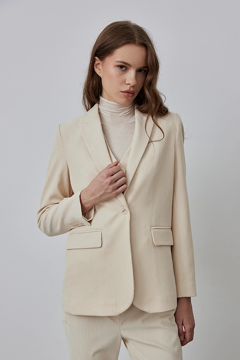 Ekru fitilli kadife blazer ceket, yumuşak dokusu ve modern kesimiyle zarif bir siluet oluşturur. Hem klasik hem casual kombinlere uyum sağlar.