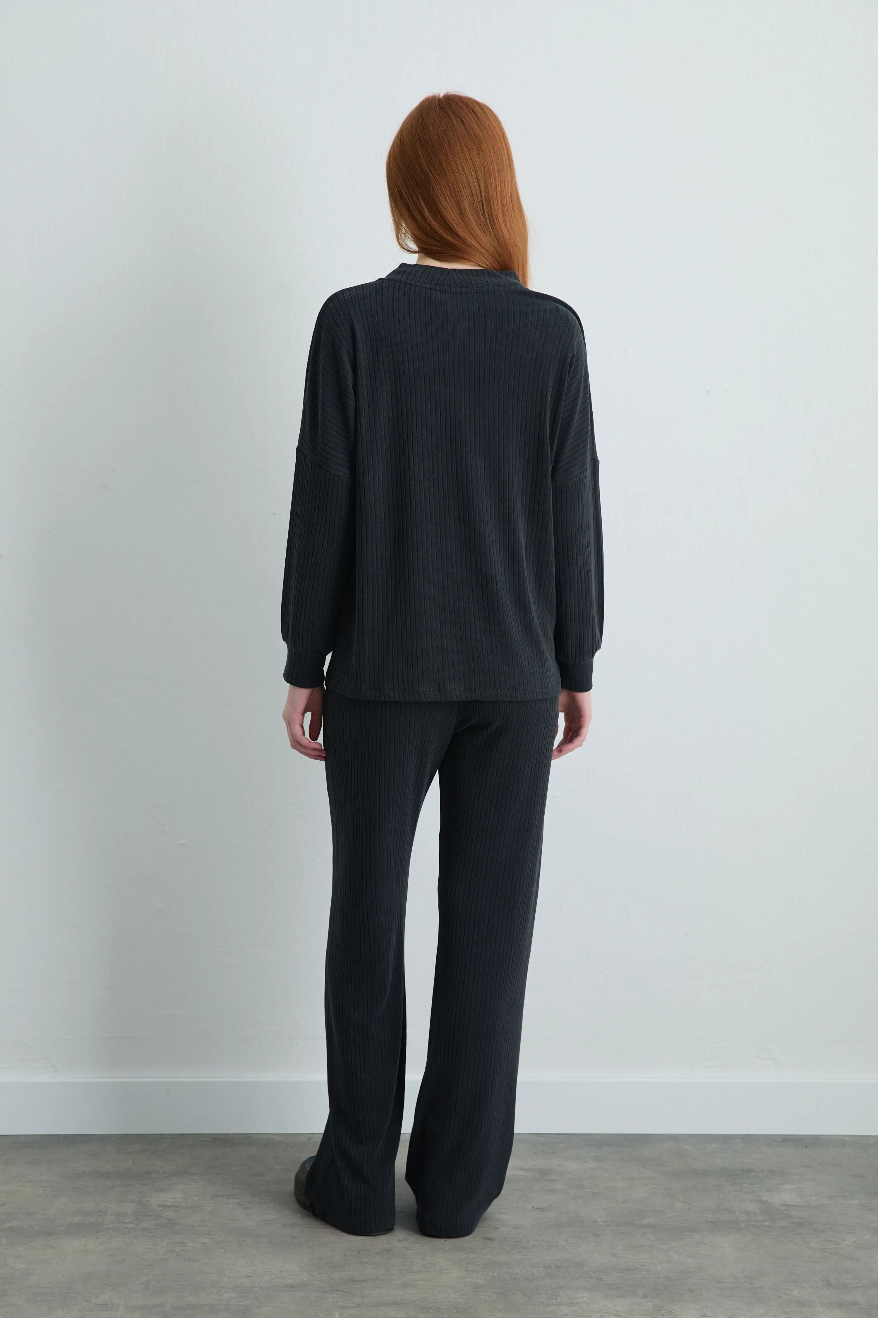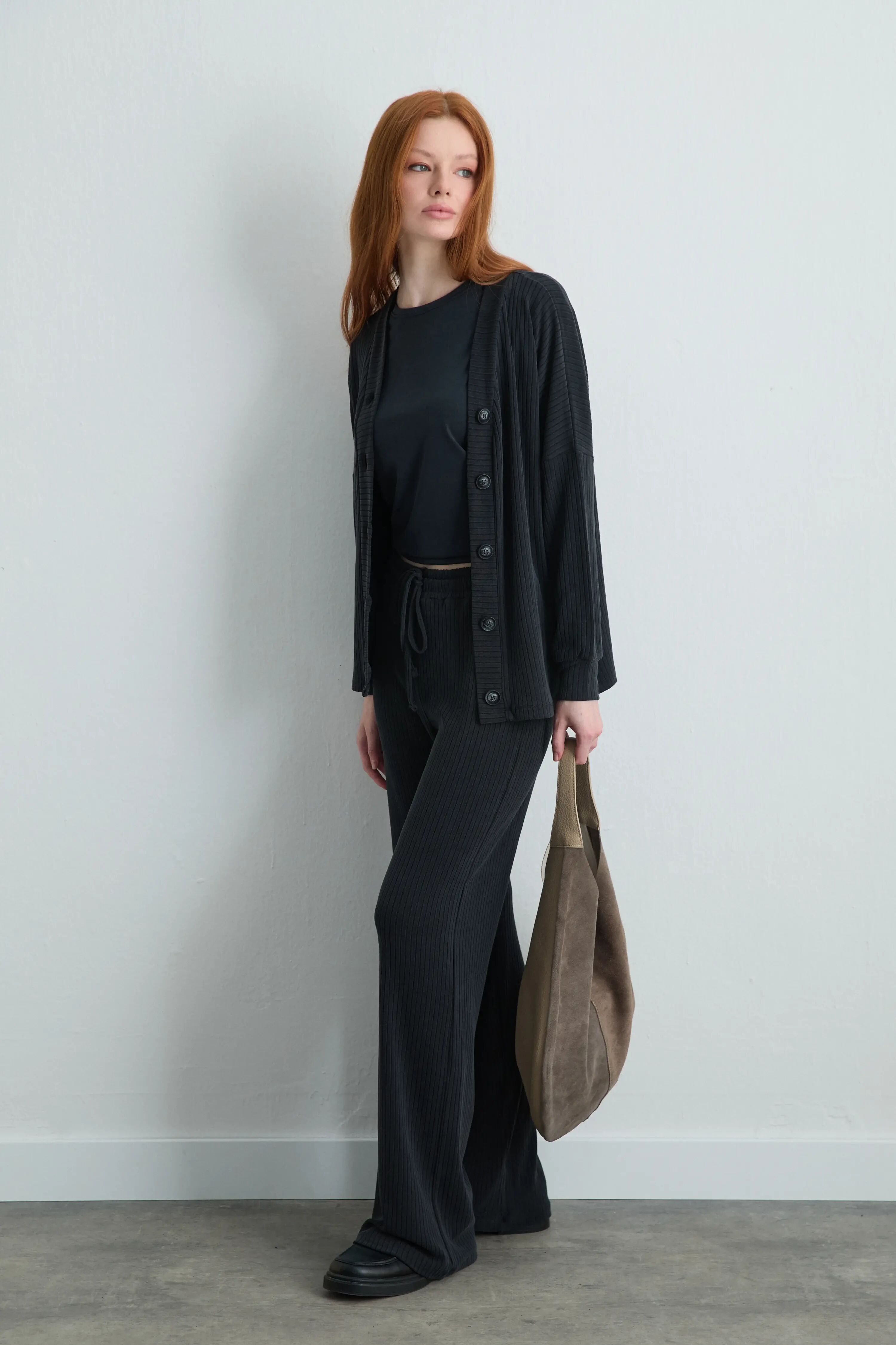 Fitilli Modal Örme Hırka & Bol Paça Pantolon - Gri