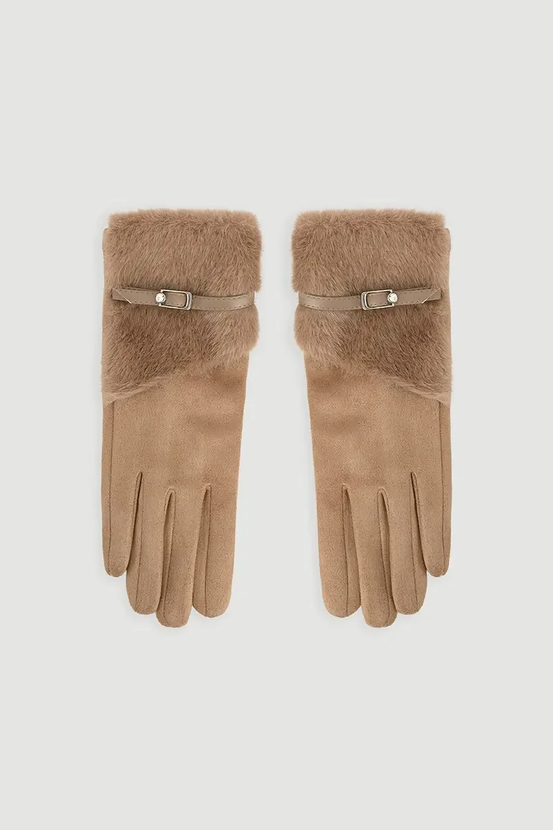 Its mink color adds a warm and sophisticated look. The fur details protect the hands from the cold while adding elegance. The belted design offers a refined touch. Its soft texture provides all-day comfort. With its minimal and modern design, it becomes an accessory that completes your style.