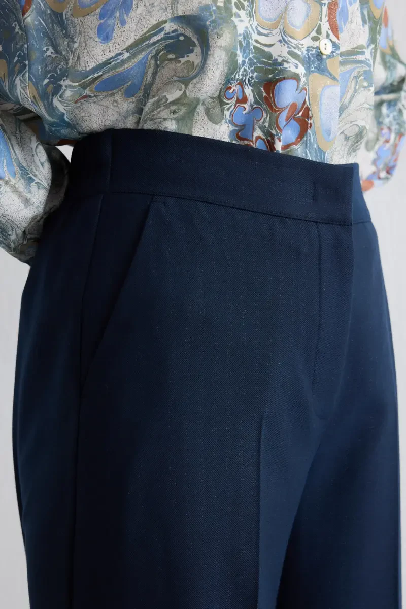 Akışkan formu sayesinde zarif bir siluet sunar. Geniş paça kesimi modern ve özgün bir tarz kazandırır. Sim çizgili deseni ışıltılı bir hava katar. Lacivert tonu hem gündüz hem gece kombinlerine uyum sağlar. Rahat kalıbıyla gün boyu konforlu bir kullanım imkânı verir.