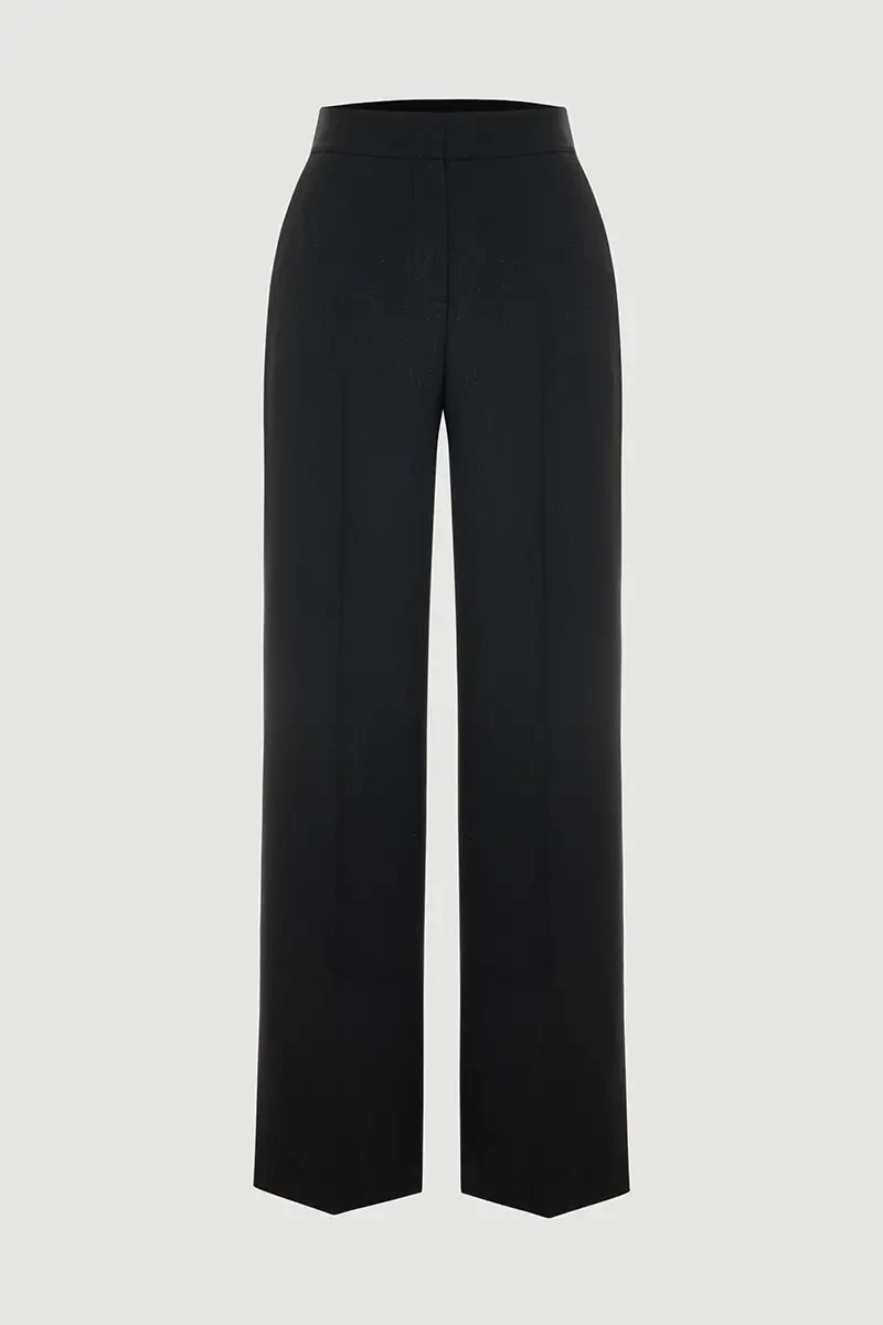 Geniş paça kesimi modern ve rahat bir siluet oluşturuyor. Sim çizgiler zarif bir ışıltı katıyor. Siyah rengi kombinlere güçlü bir duruş kazandırıyor. Günlük ve akşam stiline kolayca uyum sağlıyor. Rahat kalıbı hareket özgürlüğü sunuyor. Şık ve konforlu bir alternatif oluşturuyor.