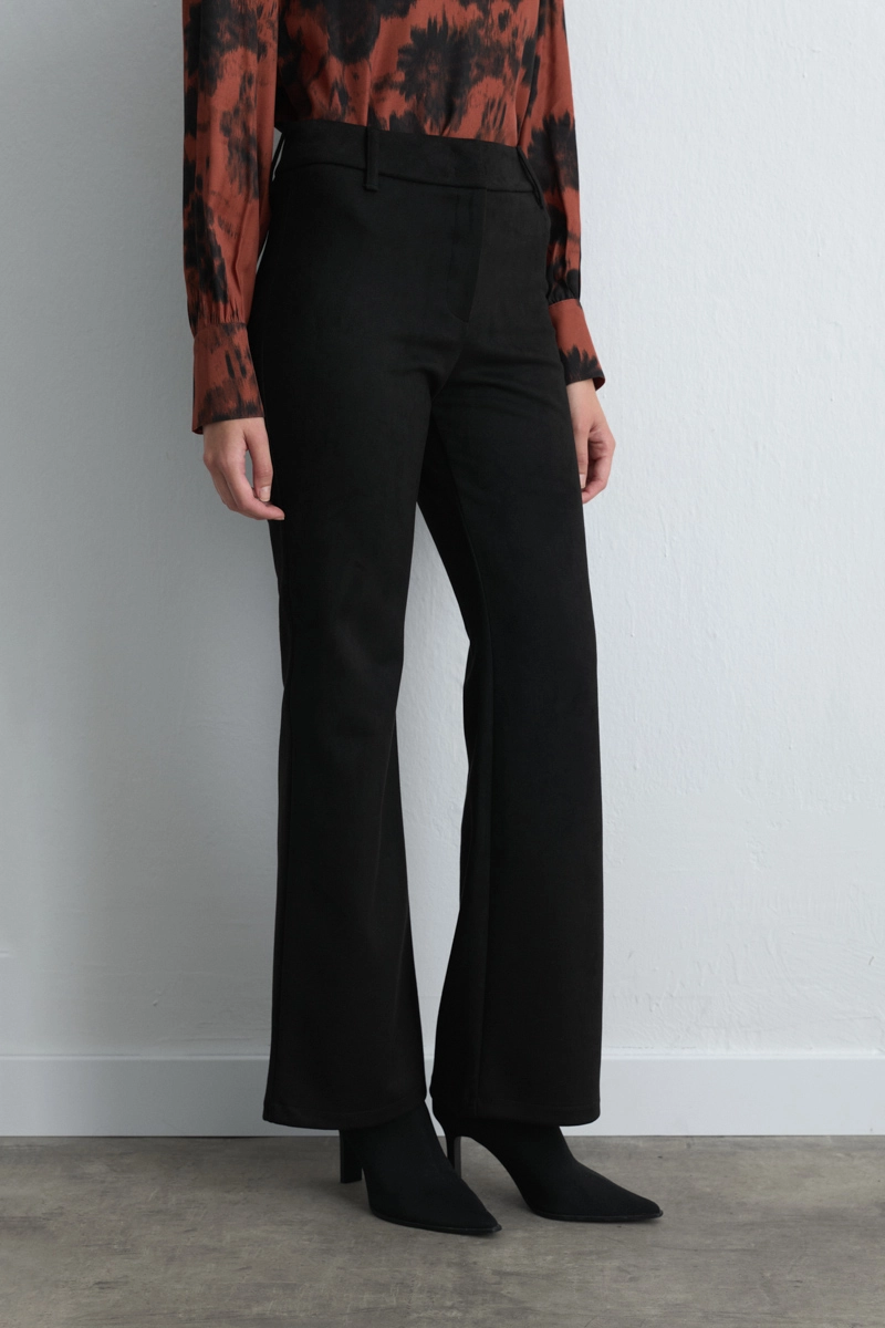 These pants, combining soft suede texture and wide-leg cut, merge comfort with elegance and become a wardrobe staple in timeless black. Offers comfort for daily wear while presenting an elegant look for special occasions. Easily pairs with blouses, shirts, or knits. Achieve a modern style with heels or boots.