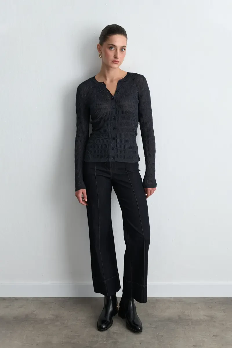 The seersucker texture stands out with its rich structure. The navy tone brings classic elegance. The knit form provides softness and comfortable wear. The buttoned design creates a practical and chic look. It can be comfortably used in daily and office outfits.
