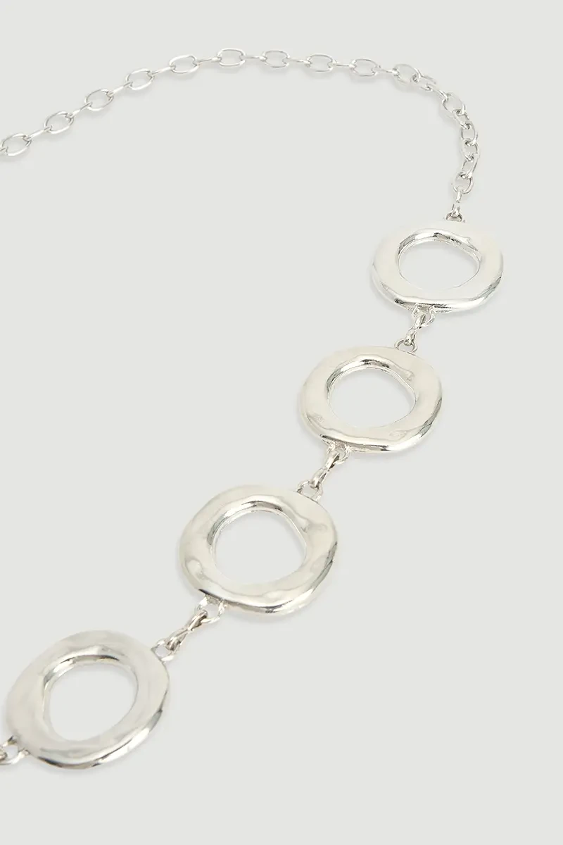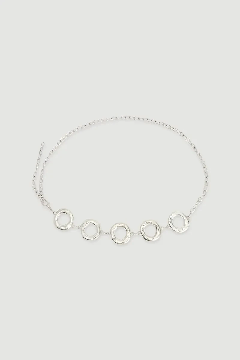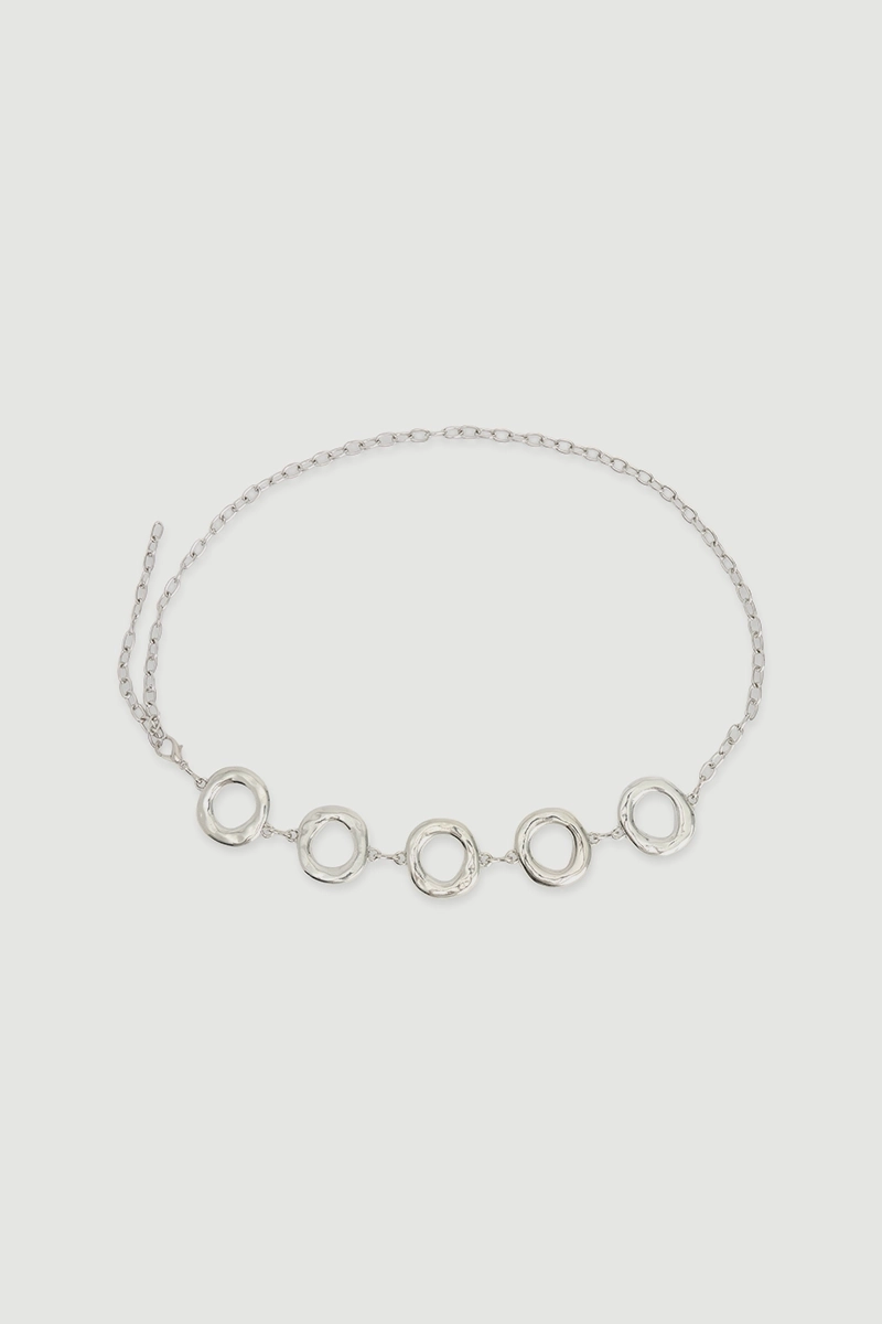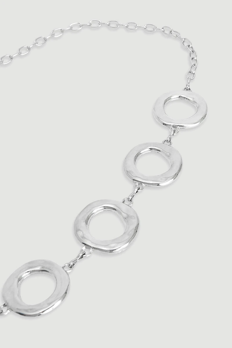 Gümüş tonu modern ve dikkat çekici bir ışıltı sunar. Halka zincir formu cesur ve stil sahibi bir duruş kazandırır. Metal yapısı dayanıklılık sağlar. Elbise, pantolon veya blazerlarla kolayca kombinlenir. Şıklığı ön plana çıkaran zarif bir aksesuar olarak öne çıkar.