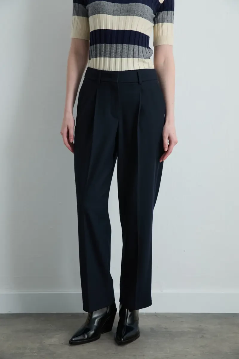 Lacivert havuç kesim pantolon, bel kısmındaki kemer detayıyla stil sahibi bir görünüm sunar. Rahat kesimi ve modern silueti sayesinde hem ofis hem gündelik kullanıma uygundur. Farklı üst parçalarla kombinlenerek çeşitli stiller yaratılabilir.