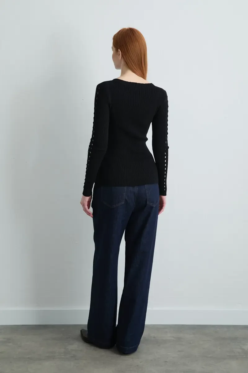 Black knit blouse features hole details on the sleeves, giving a modern and stylish design. This piece adds sophistication to daily outfits while its soft and stretchy fabric ensures comfort all day. Pair with jeans or skirts for an elegant touch.
